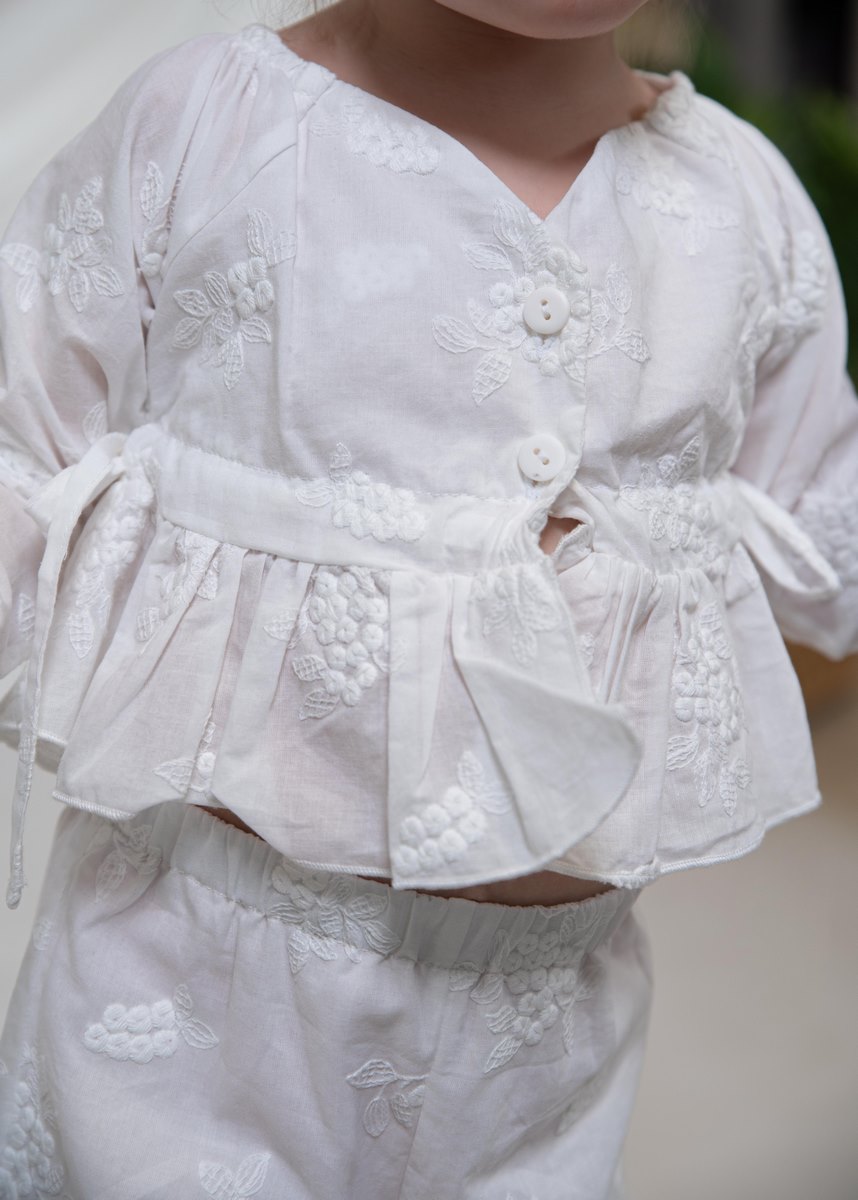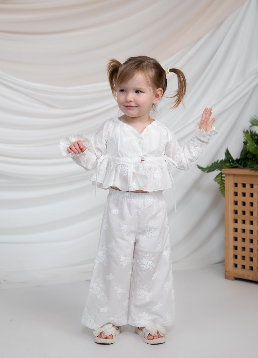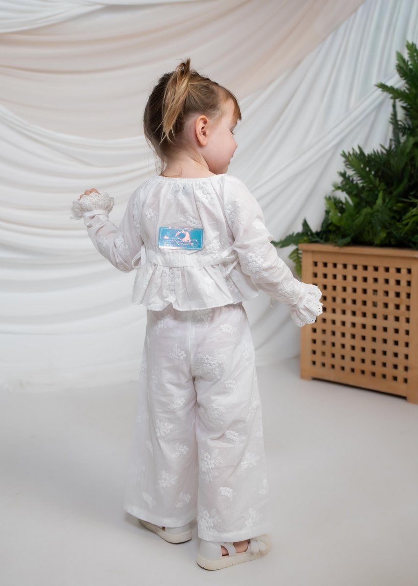 Ένα υπέροχο και κομψό σετ για μικρές δεσποινίδες, ιδανικό για ξεχωριστές εμφανίσεις! Το σετ αποτελείται από μπλούζα με μακριά μανίκια και παντελόνι, κατασκευασμένα από ελαφρύ ύφασμα με διακριτικό ανάγλυφο floral μοτίβο. Η μπλούζα διαθέτει βολάν στο τελείωμα και στα μανίκια, προσφέροντας ρομαντικό και αέρινο στυλ, ενώ το παντελόνι έχει άνετη γραμμή για ελευθερία κινήσεων. Το σύνολο ολοκληρώνεται σε απαλή λευκή απόχρωση που αποπνέει φρεσκάδα και κομψότητα. Ένα διαχρονικό σύνολο που συνδυάζει άνεση και στυλ για κάθε ιδιαίτερη στιγμή.