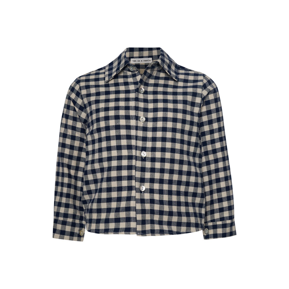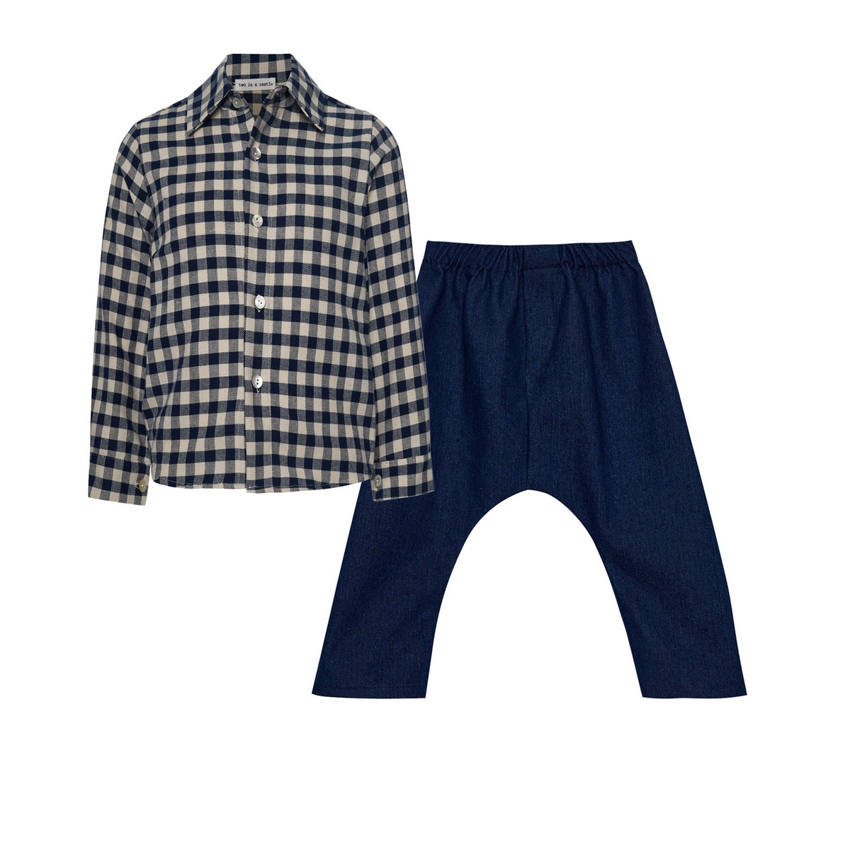 -Σετ που αποτελείται από denim παντελόνι σε άνετη γραμμή με λάστιχο στη μέση και καρό πουκάμισο