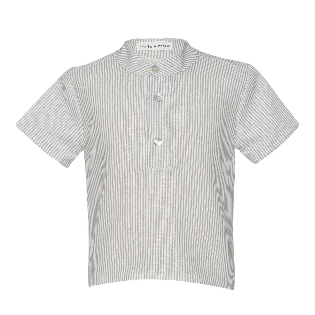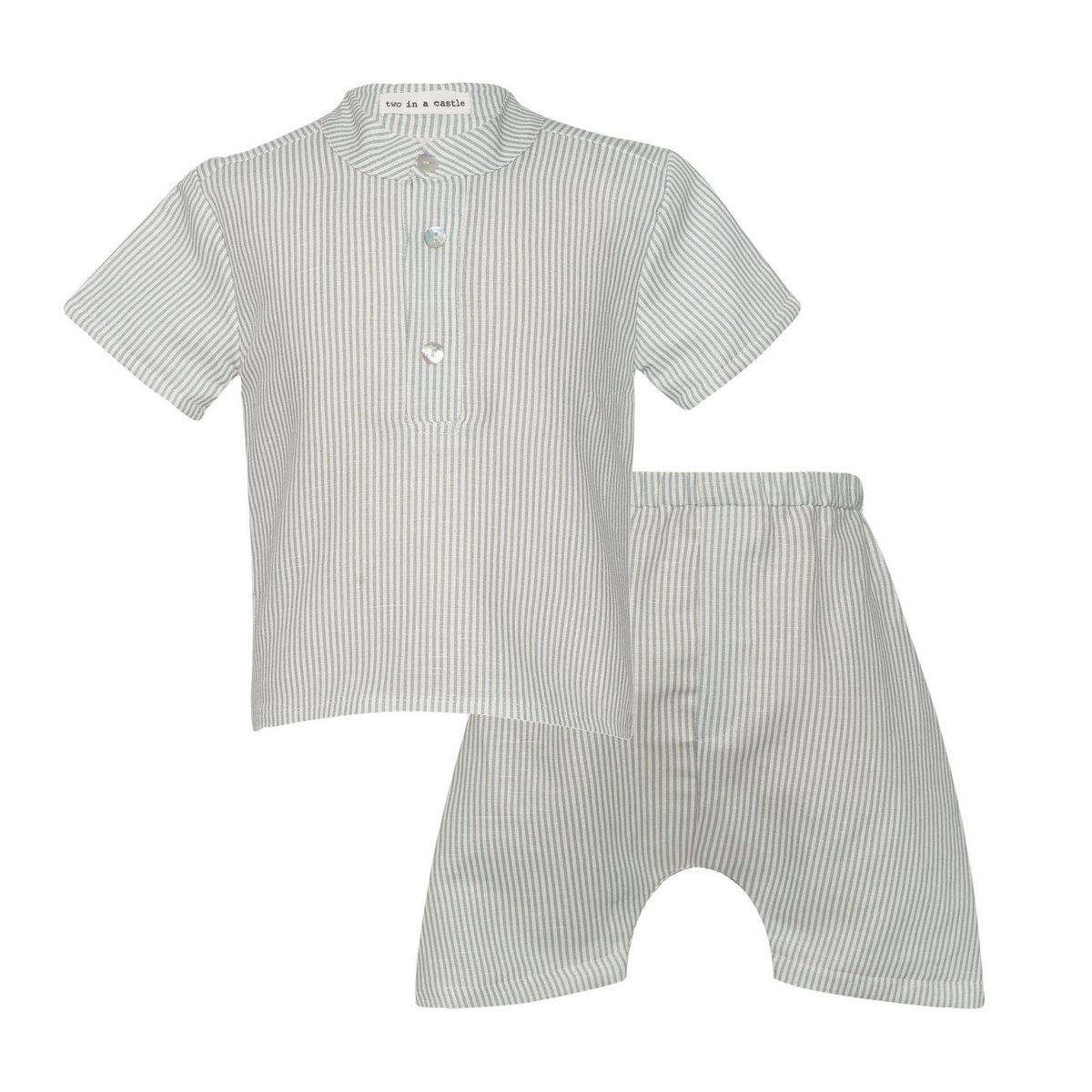 Κομψό και άνετο βρεφικό σετ Mint Sorbet της Two in a Castle ριγέ για αγόρια, ιδανικό για τις καλοκαιρινές εμφανίσεις αλλά και τις πιο ιδιαίτερες περιστάσεις. Περιλαμβάνει κοντομάνικο πουκάμισο τουνίκ με mao γιακά και κουμπάκια στο στήθος και σορτσάκι με λάστιχο στη μέση σε ταιριαστό ύφασμα και χρώμα. Άνετη εφαρμογή για ελευθερία κινήσεων από μαλακό και δροσερό ύφασμα, φιλικό προς το ευαίσθητο δέρμα του μωρού σας.