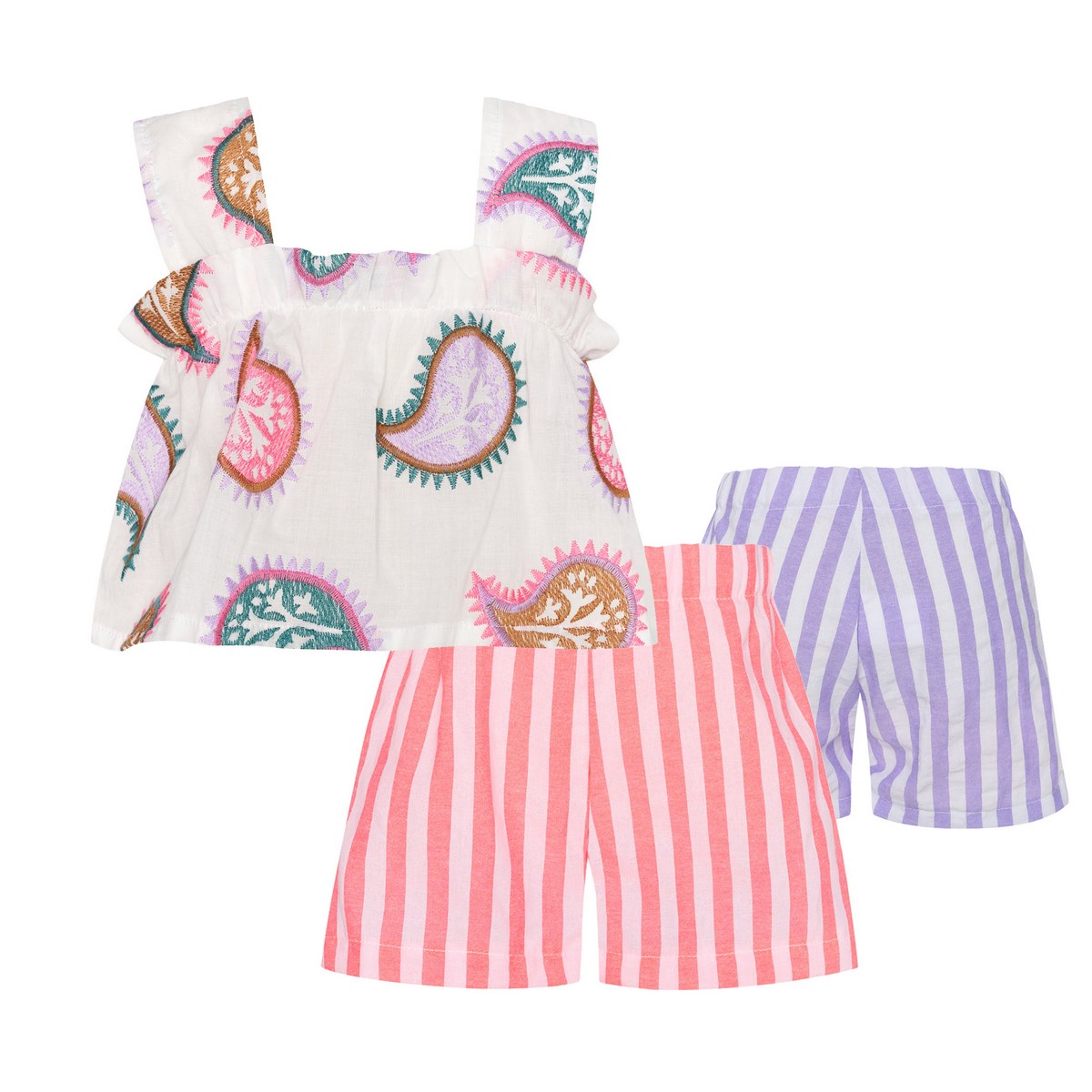 Το βρεφικό σετ Radiant της Two In A Castle συνδυάζει άνεση και παιχνιδιάρικο καλοκαιρινό στυλ. Το σύνολο αποτελείται από εμπριμέ τοπ με ιδιαίτερο σχέδιο που δίνει ζωντάνια και χαρακτήρα, καθώς και ριγέ σορτς με διαφορετικό χρώμα σε κάθε πλευρά που προσφέρουν δροσερή και άνετη εφαρμογή. Το ελαφρύ ύφασμα επιτρέπει στο δέρμα του μωρού να αναπνέει, ενώ η χαλαρή γραμμή εξασφαλίζει ελευθερία κινήσεων σε κάθε δραστηριότητα. Ιδανικό για βόλτες, διακοπές και καθημερινές καλοκαιρινές εμφανίσεις, το σετ φοριέται εύκολα και συνδυάζει πρακτικότητα με μοντέρνα αισθητική, προσφέροντας ένα ολοκληρωμένο και χαριτωμένο outfit για μικρά κοριτσάκια.