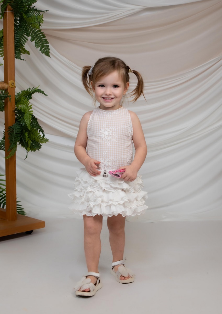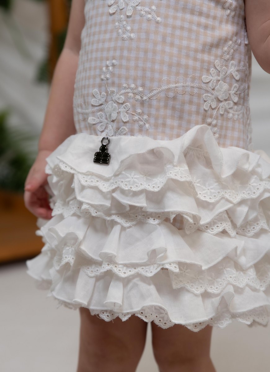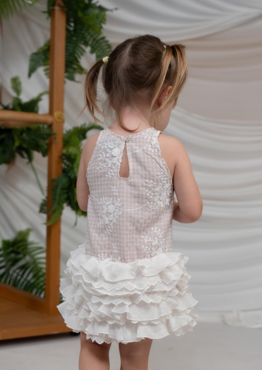 Αυτό το αμάνικο καρό βρεφικό φόρεμα της Minimo με φλοράλ κέντημα και πολυεπίπεδα βολάν είναι ιδανική επιλογή για τις ιδιαίτερες εμφανίσεις του μωρού σας.