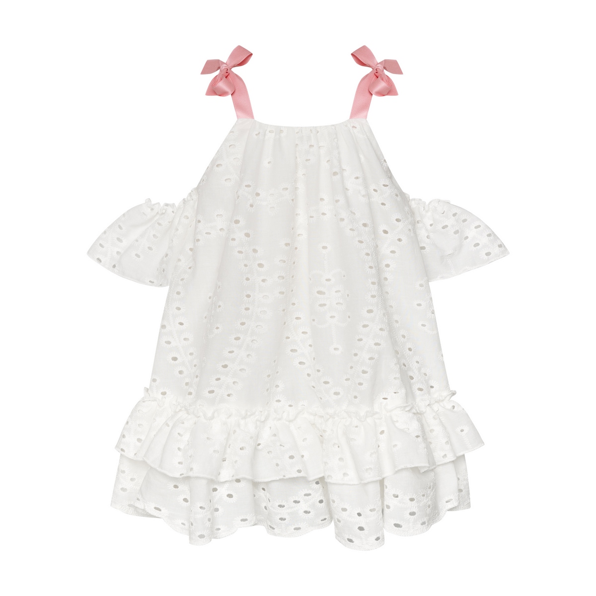 Βρεφικό φόρεμα The flower girls της Two in a Castle σε λευκό χρώμα από ύφασμα broderie anglaise με διάτρητο σχέδιο, που χαρίζει ρομαντική και καλοκαιρινή αισθητική. Διαθέτει λεπτές τιράντες που δένονται με φιόγκους στους ώμους σε απαλό ροζ χρώμα, προσθέτοντας γλυκιά και παιχνιδιάρικη λεπτομέρεια. Το σχέδιο με ανοιχτούς ώμους και  η άνετη γραμμή προσφέρουν δροσερή εφαρμογή, ενώ το τελείωμα βολάν χαρίζει κίνηση και κομψότητα. Ιδανικό για καλοκαιρινές βόλτες, γιορτές και ιδιαίτερες περιστάσεις.
