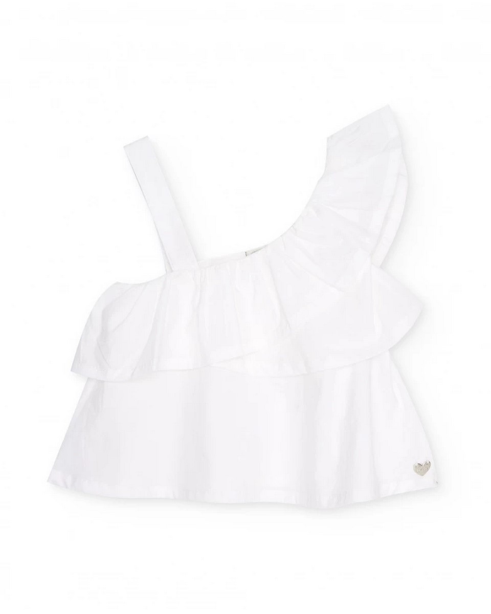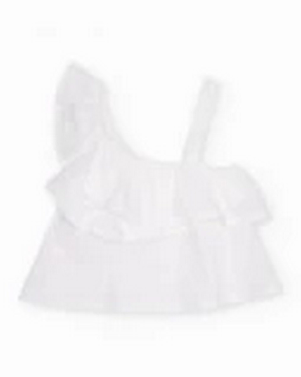 Μπλούζα για κορίτσια σε λευκό χρώμα, κατασκευασμένη από ελαφρύ και απαλό ύφασμα που προσφέρει μια φρέσκια και άνετη αίσθηση. Διαθέτει ασύμμετρο σχέδιο με φαρδύ βολάν που ακολουθεί το ντεκολτέ και τις τιράντες, προσθέτοντας μια λεπτή πινελιά και αίσθηση κίνησης. Η χαλαρή σιλουέτα εξασφαλίζει άνεση και ελευθερία κινήσεων, καθιστώντας την μια ευέλικτη και κομψή επιλογή για τις ζεστές μέρες.