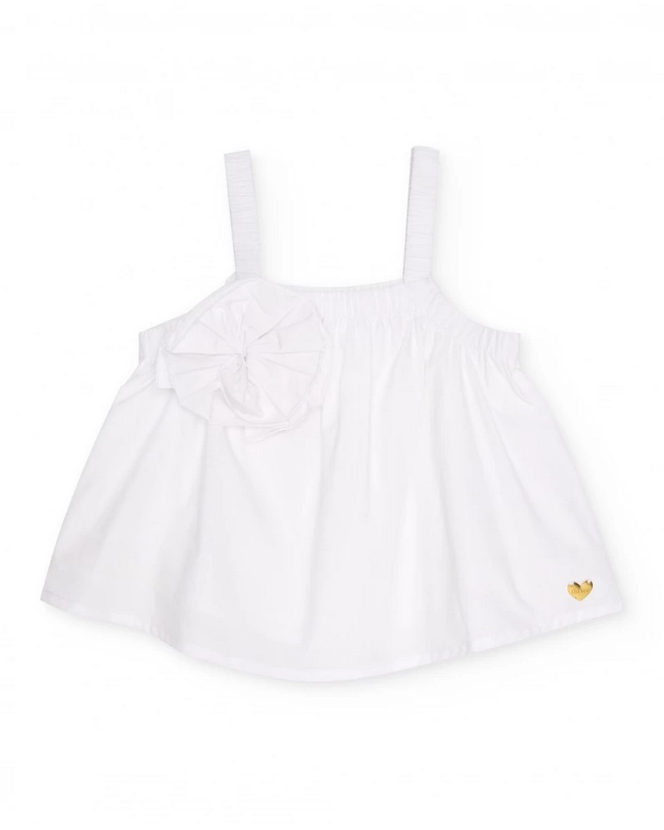 Λευκό τοπ για κορίτσια, κατασκευασμένο από απαλό, ελαφρύ ύφασμα που προσφέρει άνεση και απαλή αίσθηση. Διαθέτει τιράντες που προσθέτουν μια λεπτή πινελιά και ενισχύουν την εφαρμογή. Ένα μεγάλο διακοσμητικό λουλούδι από ύφασμα στο μπροστινό μέρος προσδίδει μια κομψή και ξεχωριστή λεπτομέρεια στο σχέδιο. Η φαρδιά σιλουέτα επιτρέπει την ελευθερία κινήσεων, καθιστώντας το μια φρέσκια και ευχάριστη επιλογή για τις ζεστές μέρες. Ένα ευέλικτο και γοητευτικό τοπ, ιδανικό για συνδυασμό με διαφορετικά ρούχα για να δημιουργήσετε κομψά σύνολα.