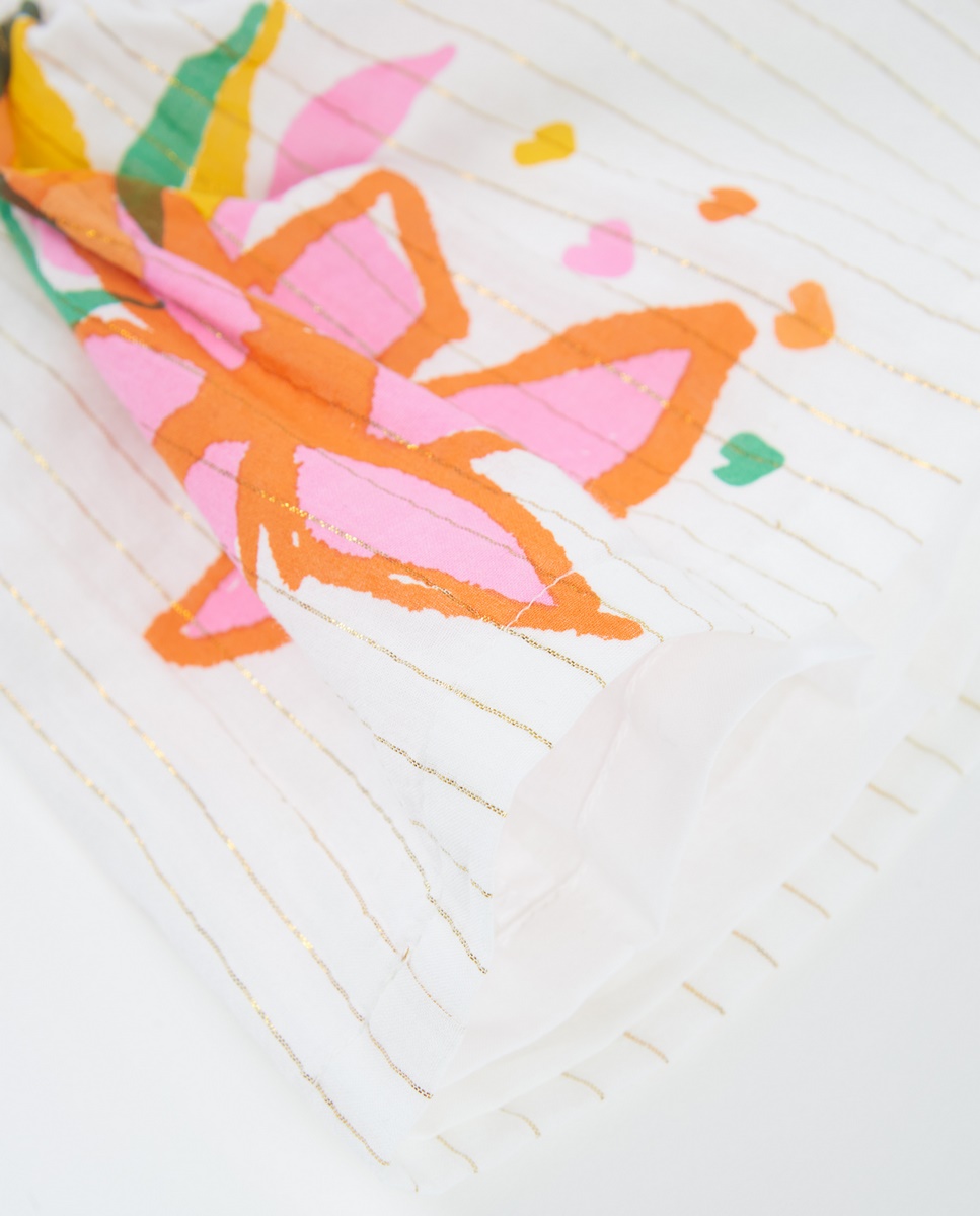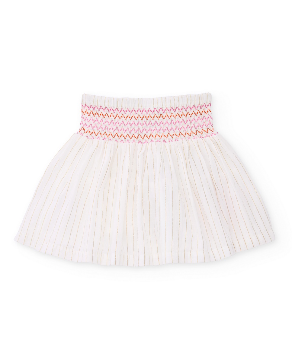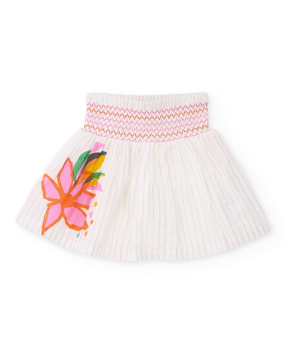 Φούστα για κορίτσια σε λευκό χρώμα, κατασκευασμένη από ελαφρύ και απαλό ύφασμα που προσφέρει καθημερινή άνεση. Η ελαστική ζώνη διαθέτει σούρες με κέντημα σε ροζ και πορτοκαλί αποχρώσεις, εξασφαλίζοντας άνετη εφαρμογή και διακοσμητική πινελιά. Το κάτω μέρος είναι διακοσμημένο με πολύχρωμο φλοράλ τύπωμα που προσθέτει μια χαρούμενη, καλοκαιρινή αίσθηση. Ένα φρέσκο ​​και ευέλικτο κομμάτι, ιδανικό για να συνδυαστεί με μπλουζάκια ή τοπ τις ζεστές μέρες.