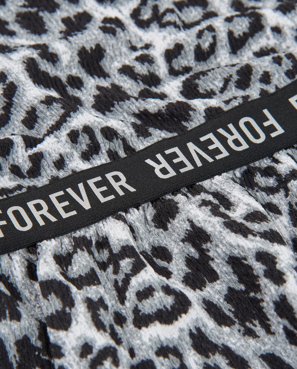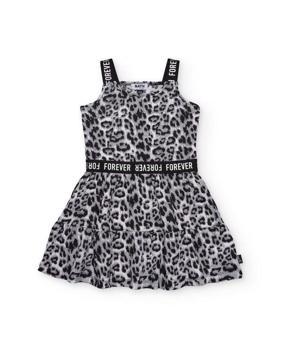 Φόρεμα για κορίτσια σε μαύρο και γκρι τόνους, κατασκευασμένο από απαλό ύφασμα με animal print που του δίνει μια μοντέρνα και εντυπωσιακή εμφάνιση. Διαθέτει ελαστικές τιράντες με τυπωμένο κείμενο, προσφέροντας άνετη εφαρμογή και μια ξεχωριστή πινελιά. Η ελαστική ζώνη με διακοσμητική ταινία αναδεικνύει τη σιλουέτα και εξασφαλίζει σταθερή εφαρμογή. Η ελαφρώς φαρδιά φούστα σε στρώσεις προσθέτει κίνηση και απαλότητα. Ένα μοντέρνο και ευέλικτο κομμάτι, ιδανικό για casual ντυσίματα.