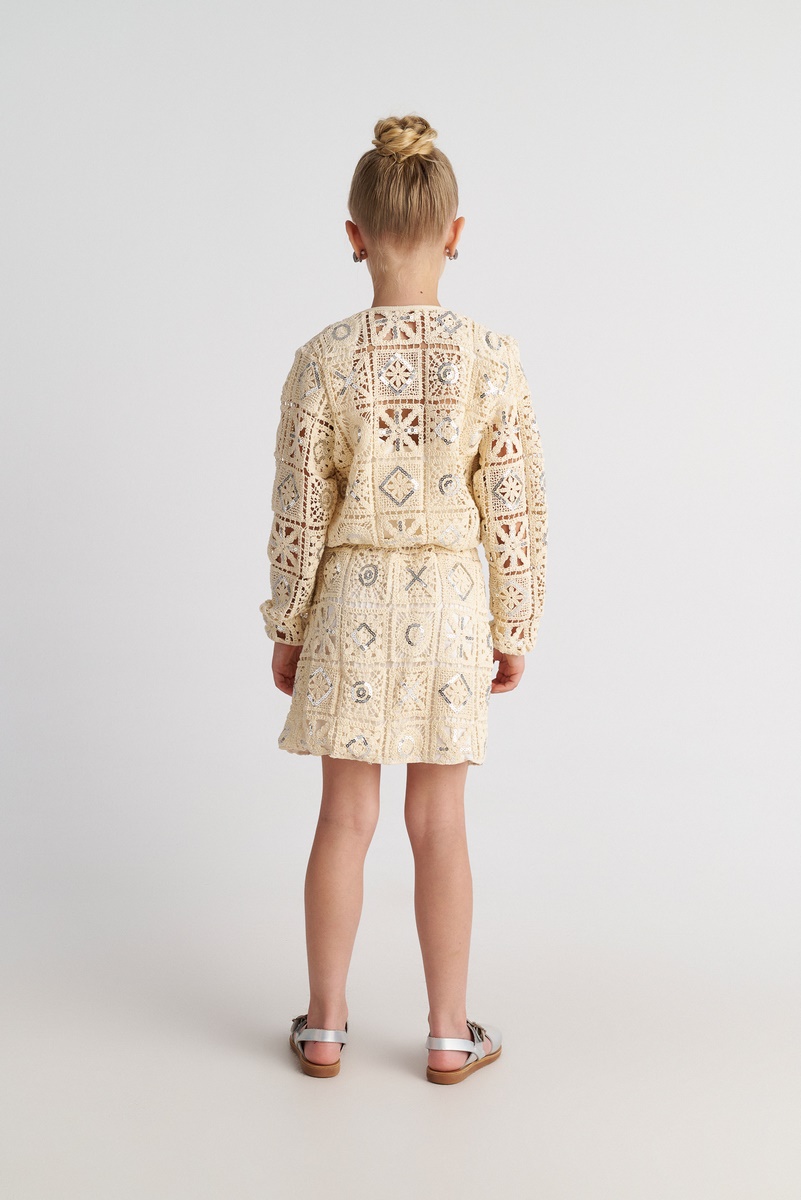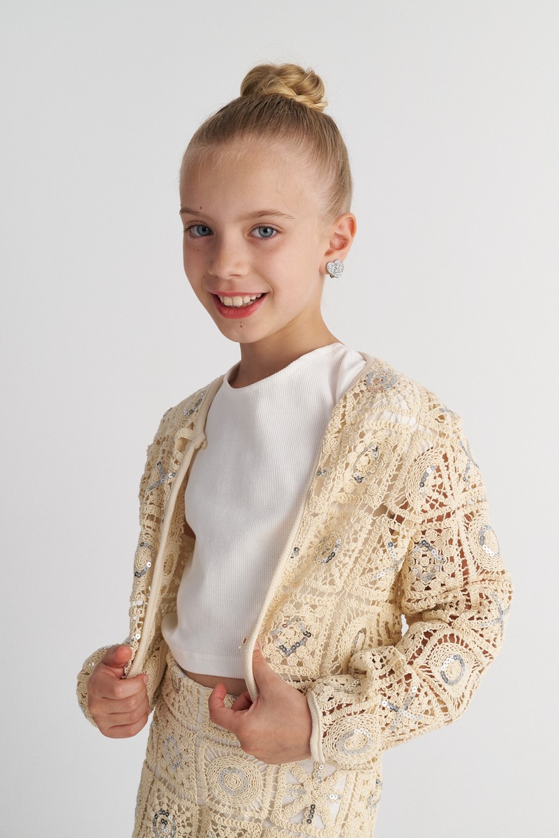 Αυτό το κομψό ζακετάκι δαντέλα Santorini της Two In A Castle για κορίτσια είναι ιδανική επιλογή για να ολοκληρώσει κάθε επίσημο ή καλοκαιρινό σύνολο. Κατασκευασμένο από φίνα δαντέλα με γεωμετρικά μοτίβα και διακριτικές παγιέτες, προσφέρει μοναδική λάμψη και κομψότητα. Διαθέτει άνετη εφαρμογή και ελαφριάυφή, ώστε να φοριέται ευχάριστα όλη την ημέρα. Ιδανικό για συνδυασμό με φορέματα, ολόσωμες φόρμες και φούστες, για γιορτές, βαπτίσεις και ιδιαίτερες περιστάσεις.