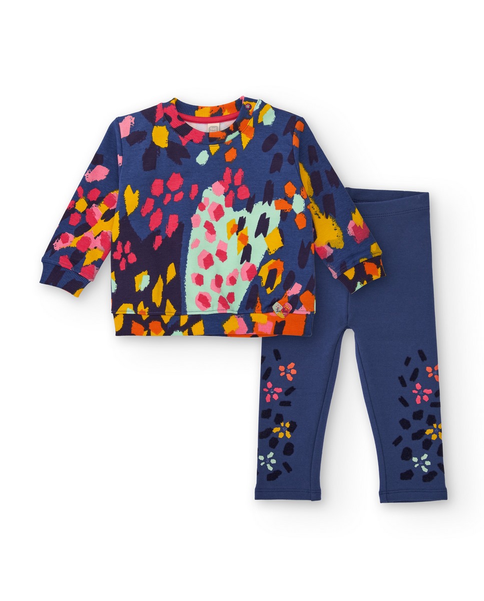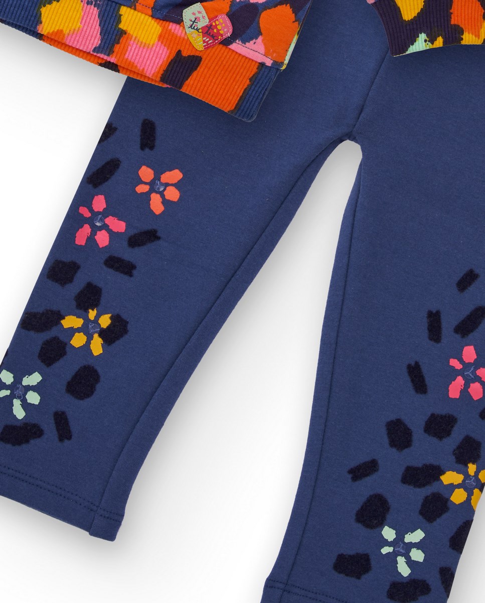 -Κοριτσίστικο σετ με φούτερ και κολάν με πολύχρωμα σχέδια σε μπλε σκούρο φόντο, στρογγυλή λαιμόκοψη, μακριά μανίκια και κλείσιμο με κούμπωμα στον ώμο.