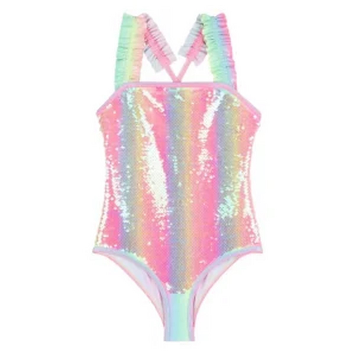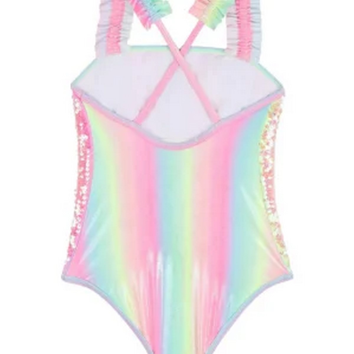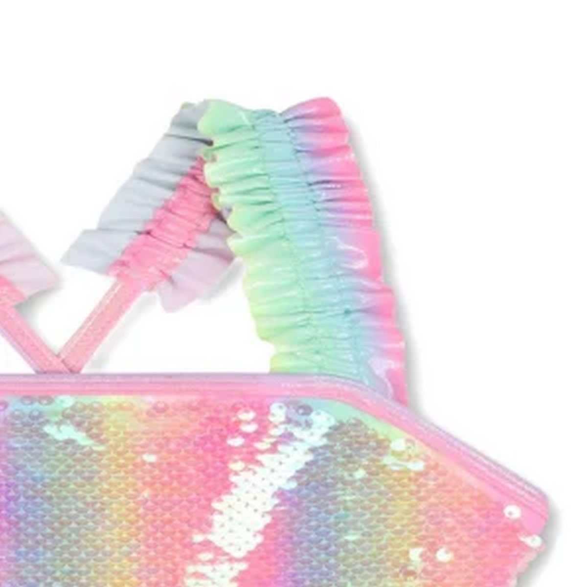 Ουράνιο τόξο ολόσωμο μαγιό για κορίτσια από την BILLIEBLUSH. Φτιαγμένο από απαλό μεταξωτό ύφασμα, διαθέτει διακοσμημένες παγιέτες στο μπροστινό μέρος και βολάν στο λουράκι ώμου. Συνοδεύεται από επώνυμη θήκη