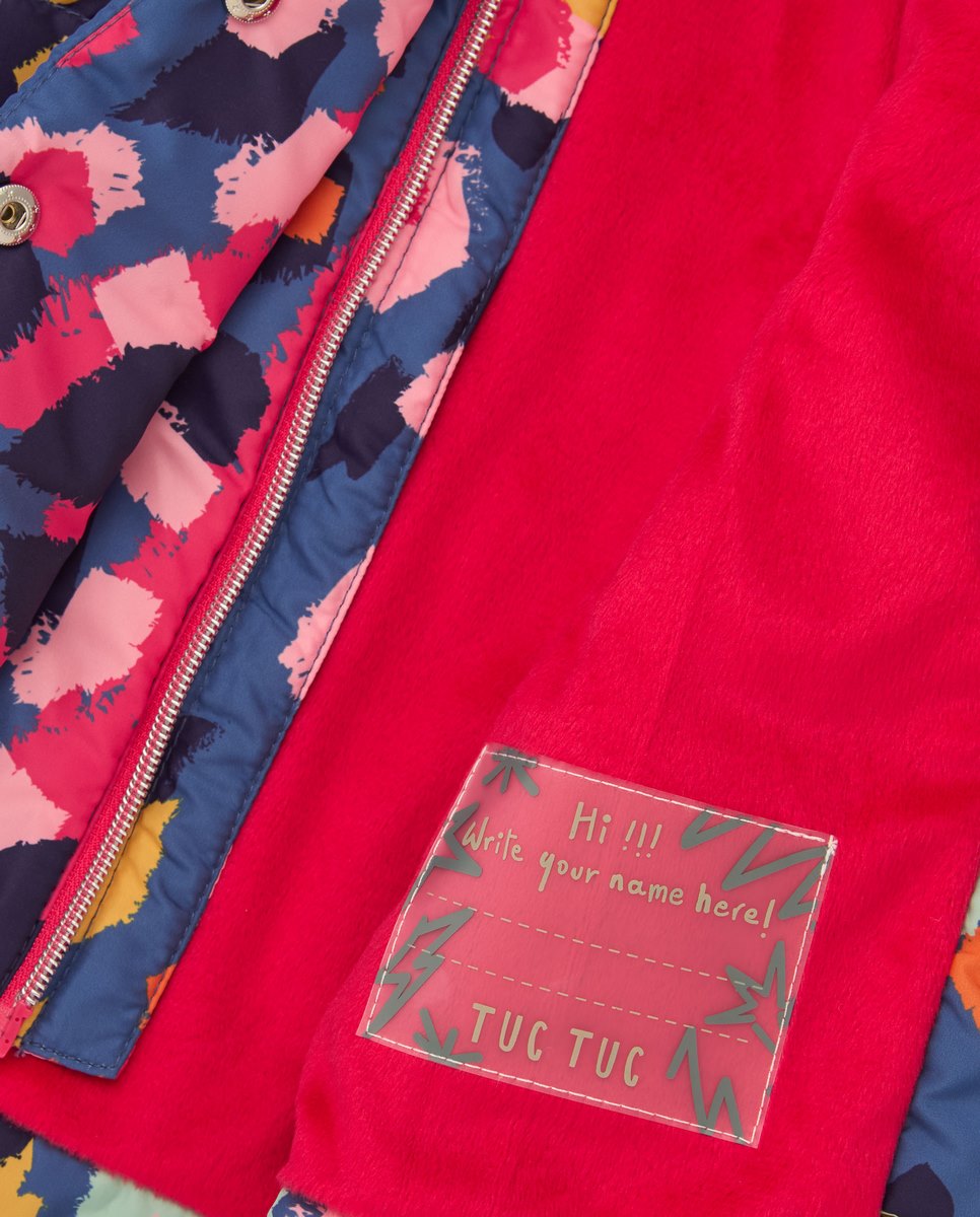-Κοριτσίστικο παλτό με επένδυση, εντυπωσιακό πολύχρωμο τύπωμα και κόκκινες τσέπες σε σχήμα καρδιάς μπροστά.
