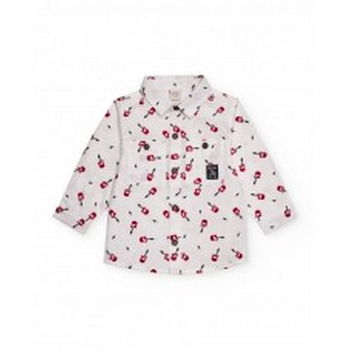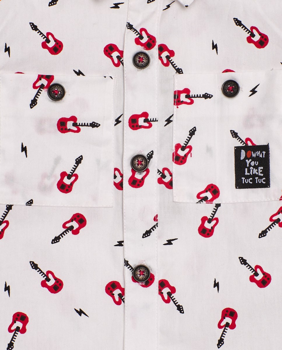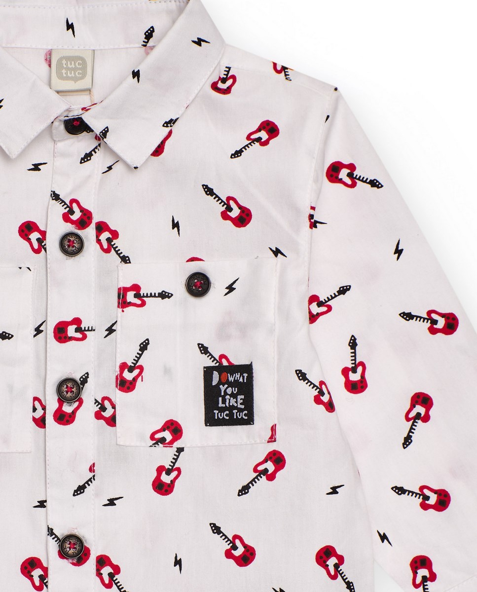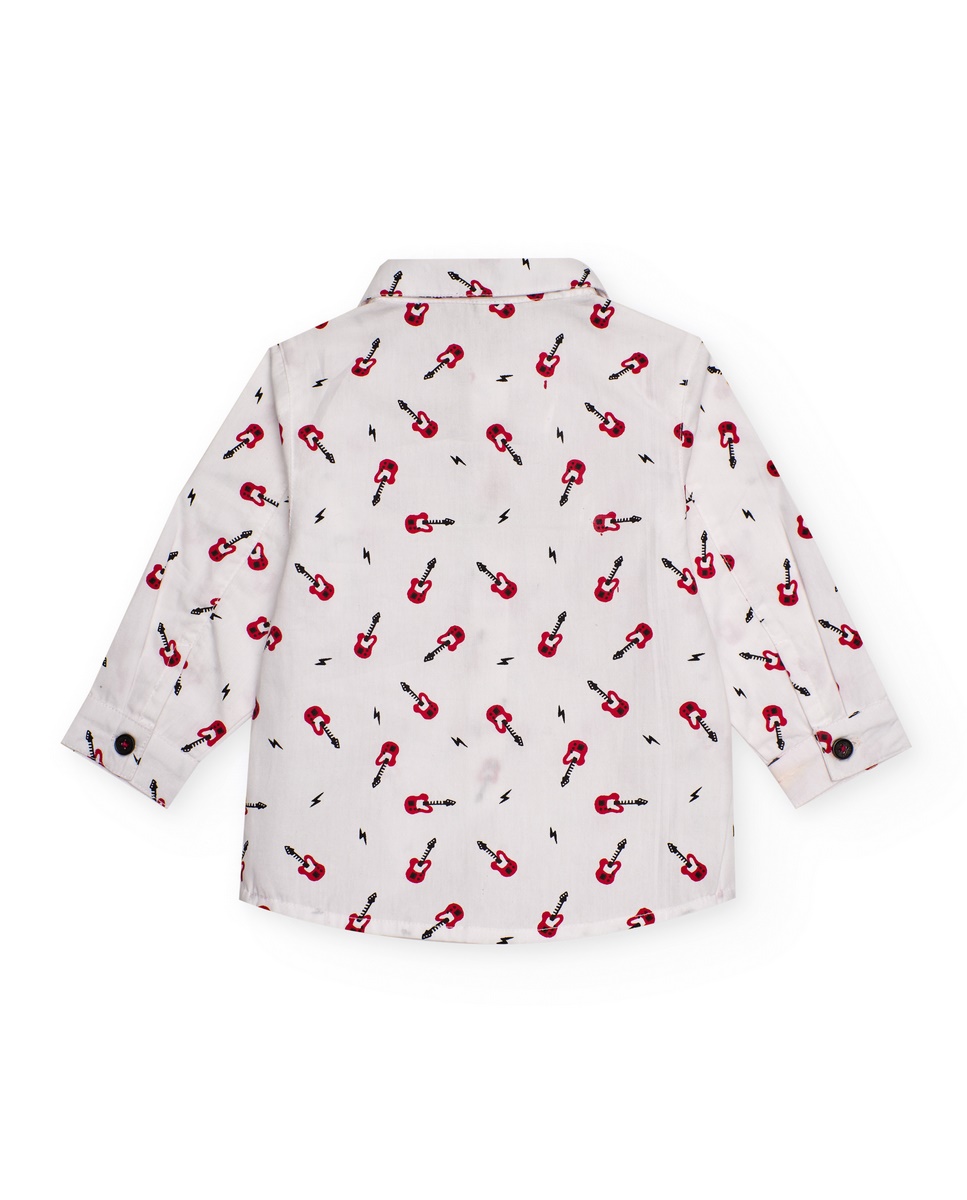 -Μακρυμάνικο πουκάμισο για αγόρια σε λευκό χρώμα με τύπωμα από κόκκινες κιθάρες και μικρά αστραπές σε όλη την επιφάνεια.
