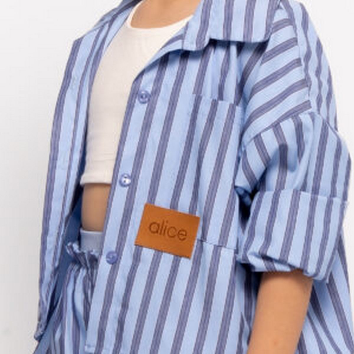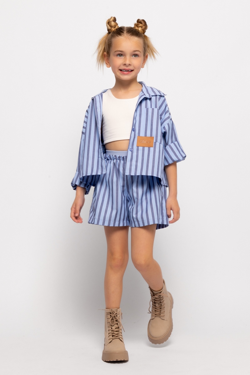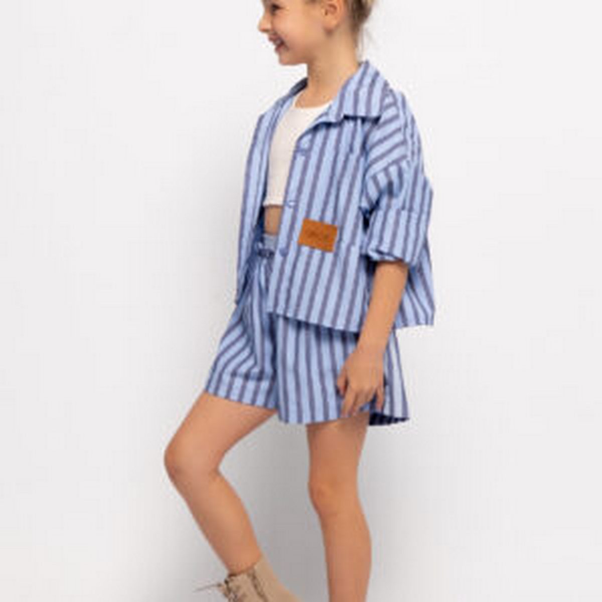 Σετ από ριγέ ποπλίνα που αποτελείται από πουκάμισο με τσέπη και διακοσμητικό label μπροστά, και σορτσάκι με διπλό ελαστικό ζωνάκι και τσέπες στα πλαϊνά.
