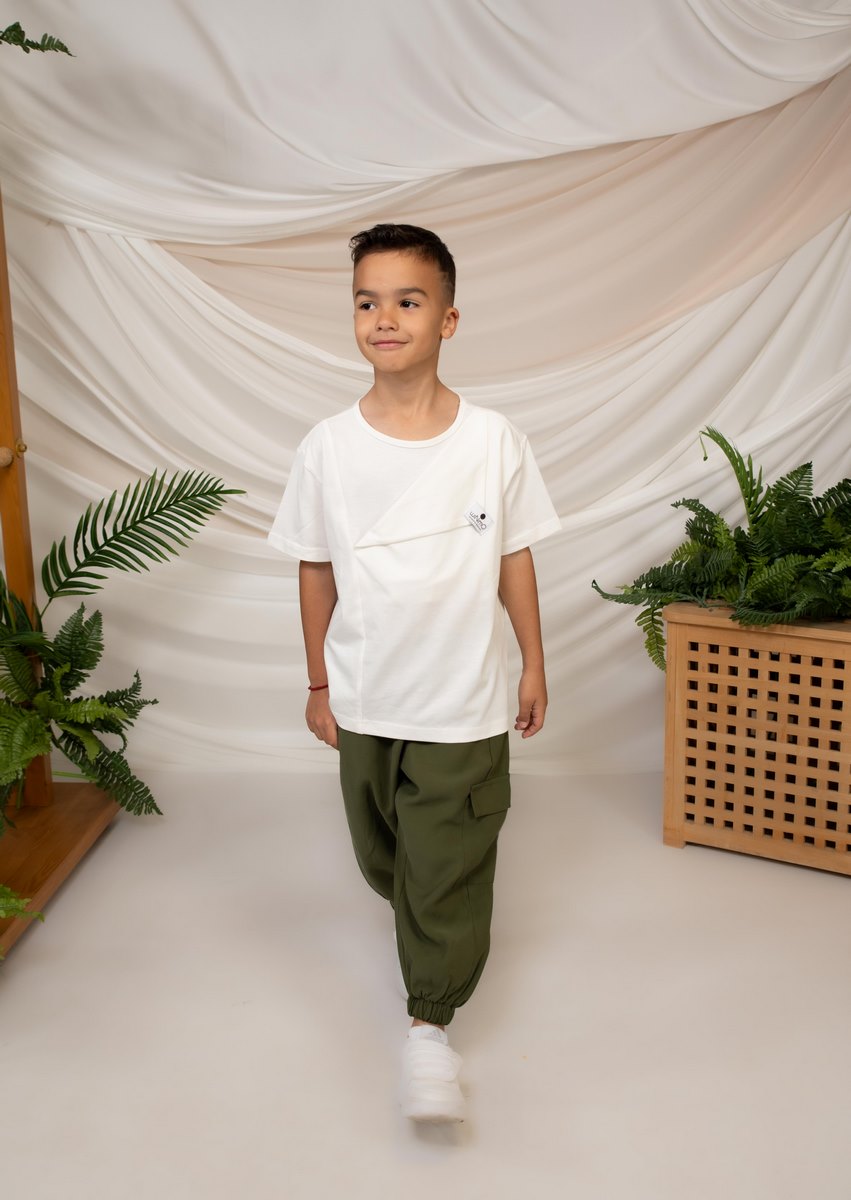Μοντέρνο παιδικό σετ που συνδυάζει άνεση και σύγχρονο street style. Το σετ αποτελείται από κοντομάνικη μπλούζα με minimal σχεδιασμό και παντελόνι cargo με πρακτικές τσέπες, δημιουργώντας ένα δυναμικό και άνετο outfit για κάθε μέρα. Η μπλούζα διαθέτει ιδιαίτερη διακοσμητική λεπτομέρεια στο μπροστινό μέρος που προσθέτει χαρακτήρα στο σύνολο. Το παντελόνι cargo ξεχωρίζει για την άνετη γραμμή, τις πλαϊνές τσέπες και το λάστιχο στο τελείωμα, προσφέροντας ελευθερία κινήσεων και μοντέρνα εμφάνιση. Ιδανική επιλογή για καθημερινές δραστηριότητες, βόλτες και casual εμφανίσεις με στυλ.