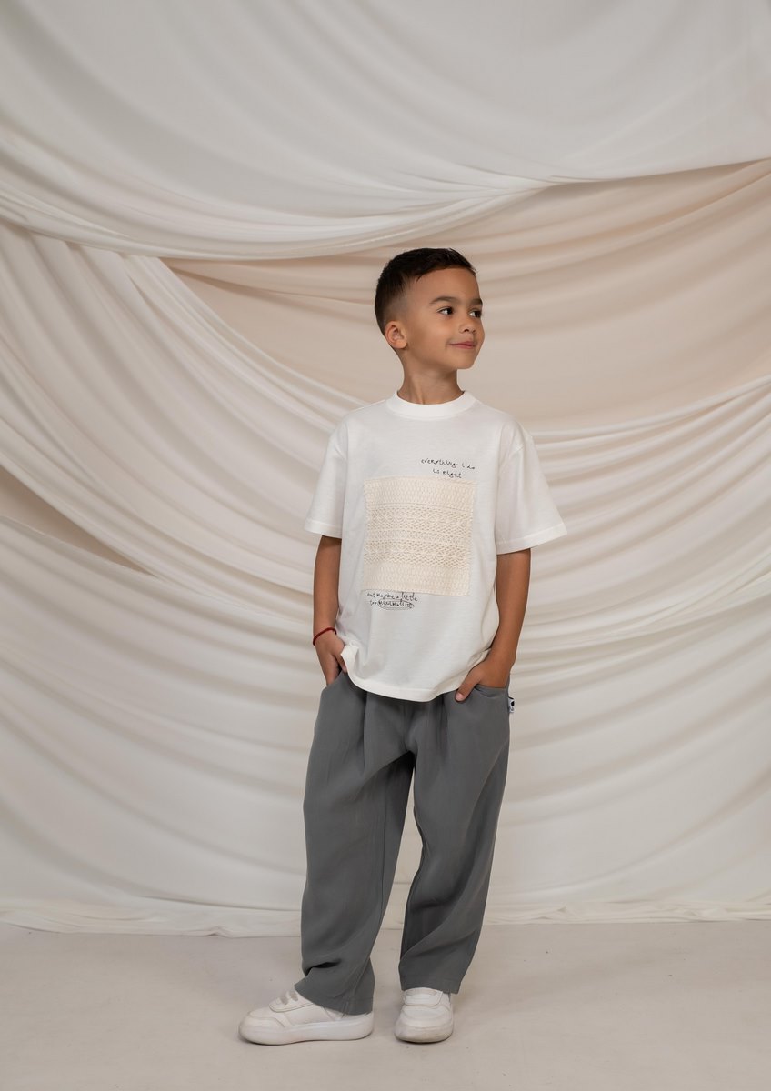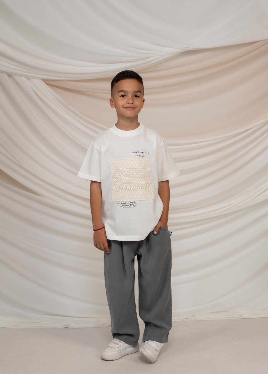 Στυλάτο και άνετο παιδικό σετ που συνδυάζει minimal αισθητική με μοντέρνες λεπτομέρειες. Το σετ αποτελείται από κοντομάνικη μπλούζα με ιδιαίτερη διακοσμητική υφή στο μπροστινό μέρος και παντελόνι σε χαλαρή γραμμή, δημιουργώντας ένα κομψό αλλά και άνετο καθημερινό look. Η μπλούζα ξεχωρίζει για το ιδιαίτερο σχέδιο στο κέντρο που δίνει χαρακτήρα στο σύνολο, ενώ το παντελόνι προσφέρει άνετη εφαρμογή και ελευθερία κινήσεων για παιχνίδι και δραστηριότητες. Ο μοντέρνος συνδυασμός χρωμάτων κάνει το σετ ιδανικό για κομψές αλλά και casual εμφανίσεις. Ένα πρακτικό και καλαίσθητο outfit που φοριέται εύκολα από το πρωί μέχρι το βράδυ.