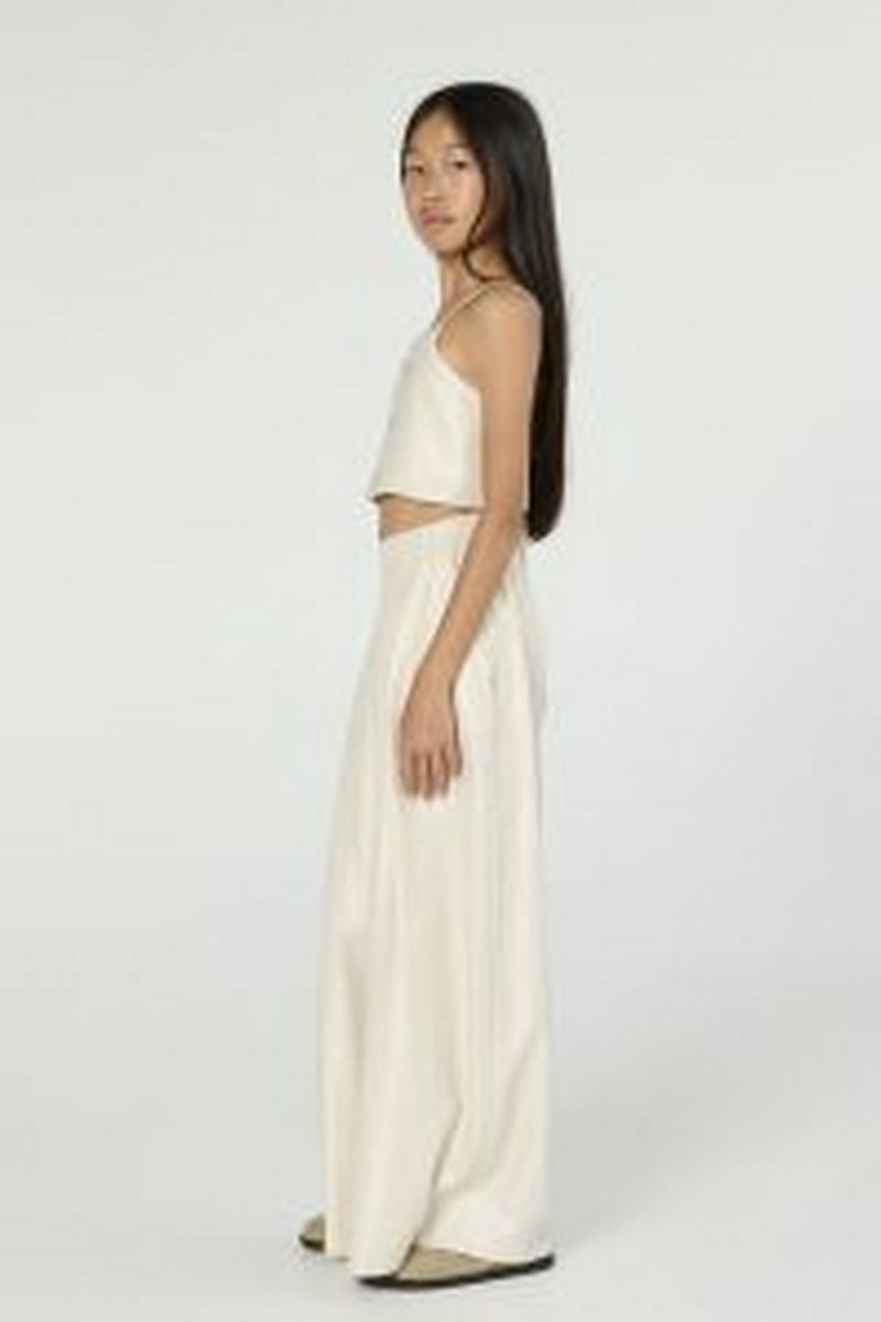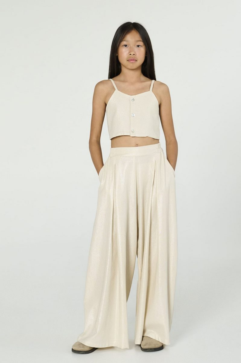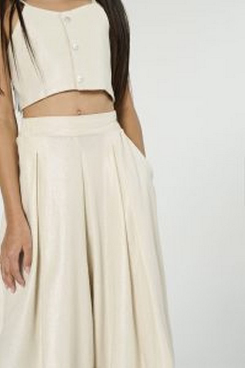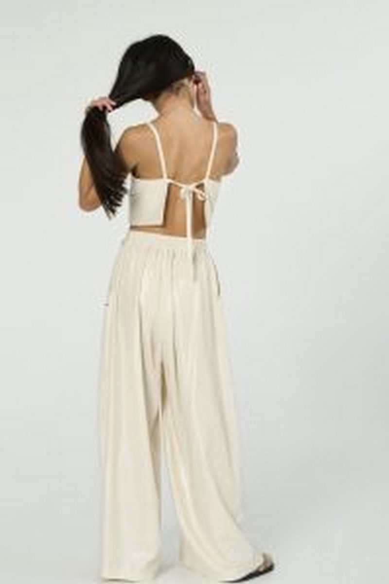 Melin Rose Μπεζ σετ, φαρδιά, ψηλόμεση παντελόνα με πιέτες & πλαϊνές τσέπες, συνδυασμένη με top με τιράντες, διακοσμητικά κουμπιά & ανοιχτή πλάτη με δέσιμο.