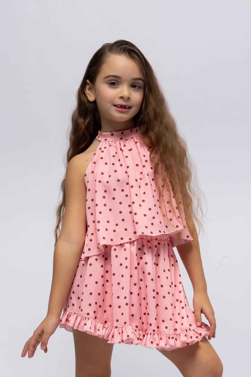 Πουά σετ που αποτελείται από αμάνικο hatler τοπ με λαιμό που δένει πίσω, σε κλος γραμμή και σορτσόφουτσα με λάστιχο στη μέση και μικρό βολάν στο τελείωμα του.
