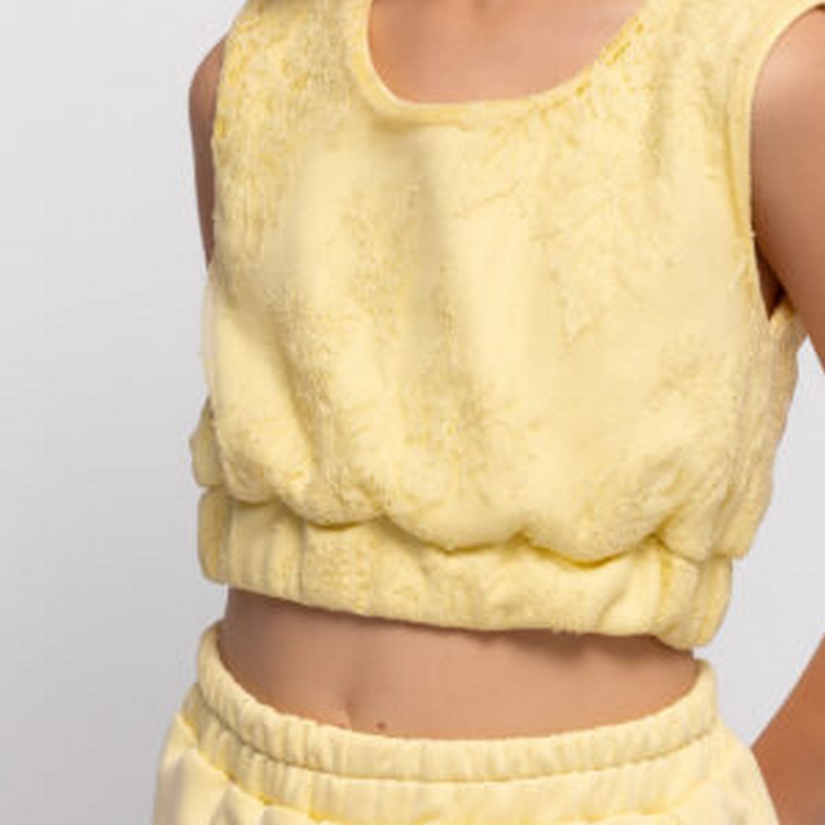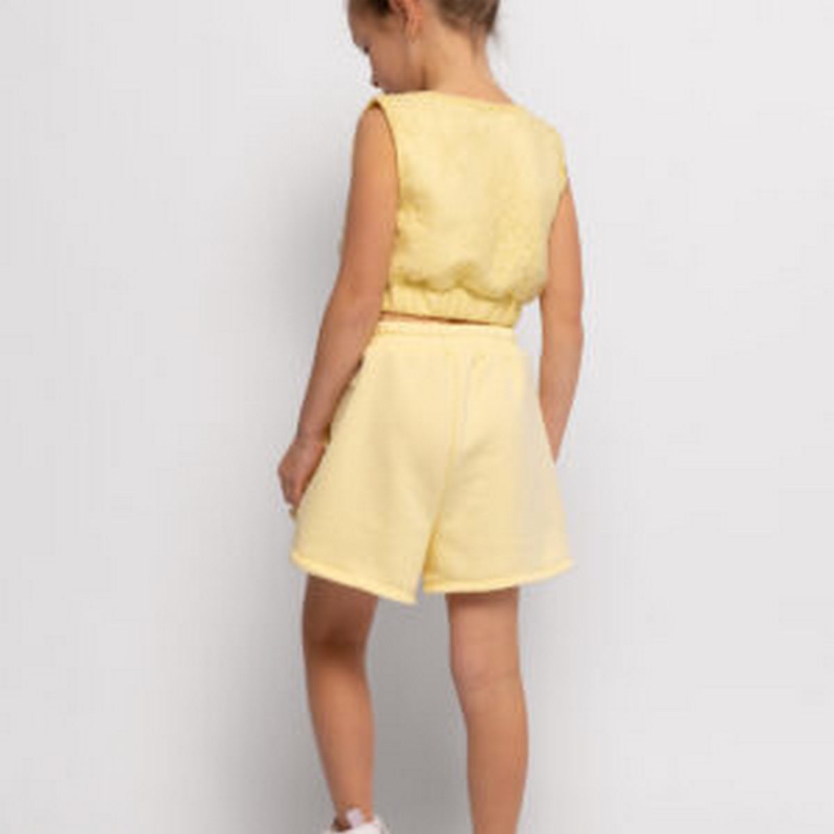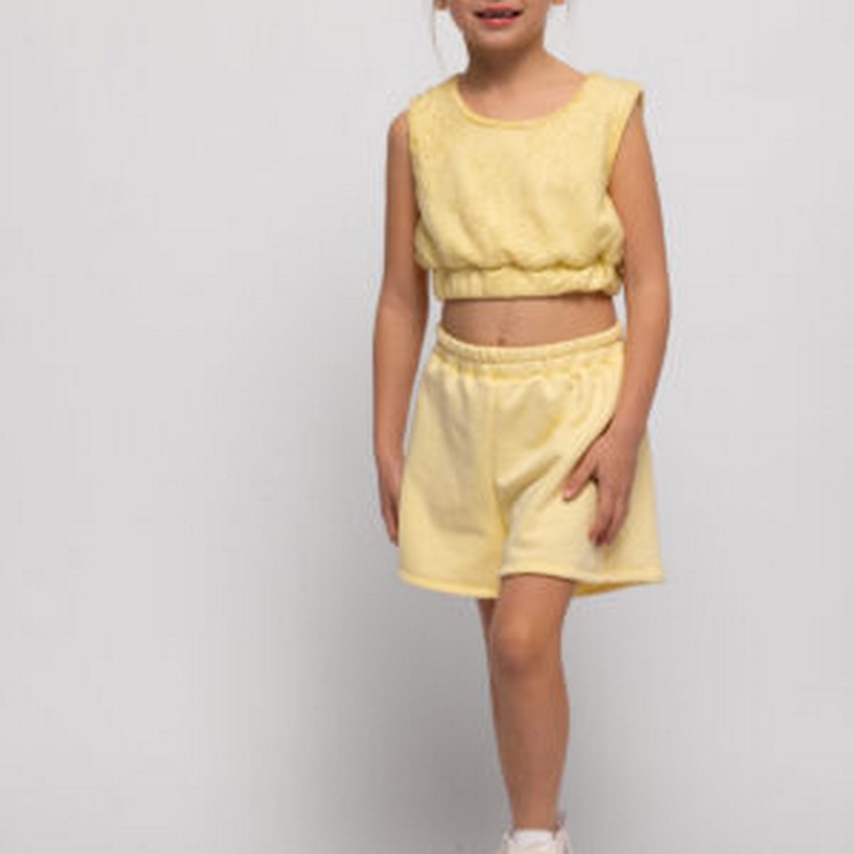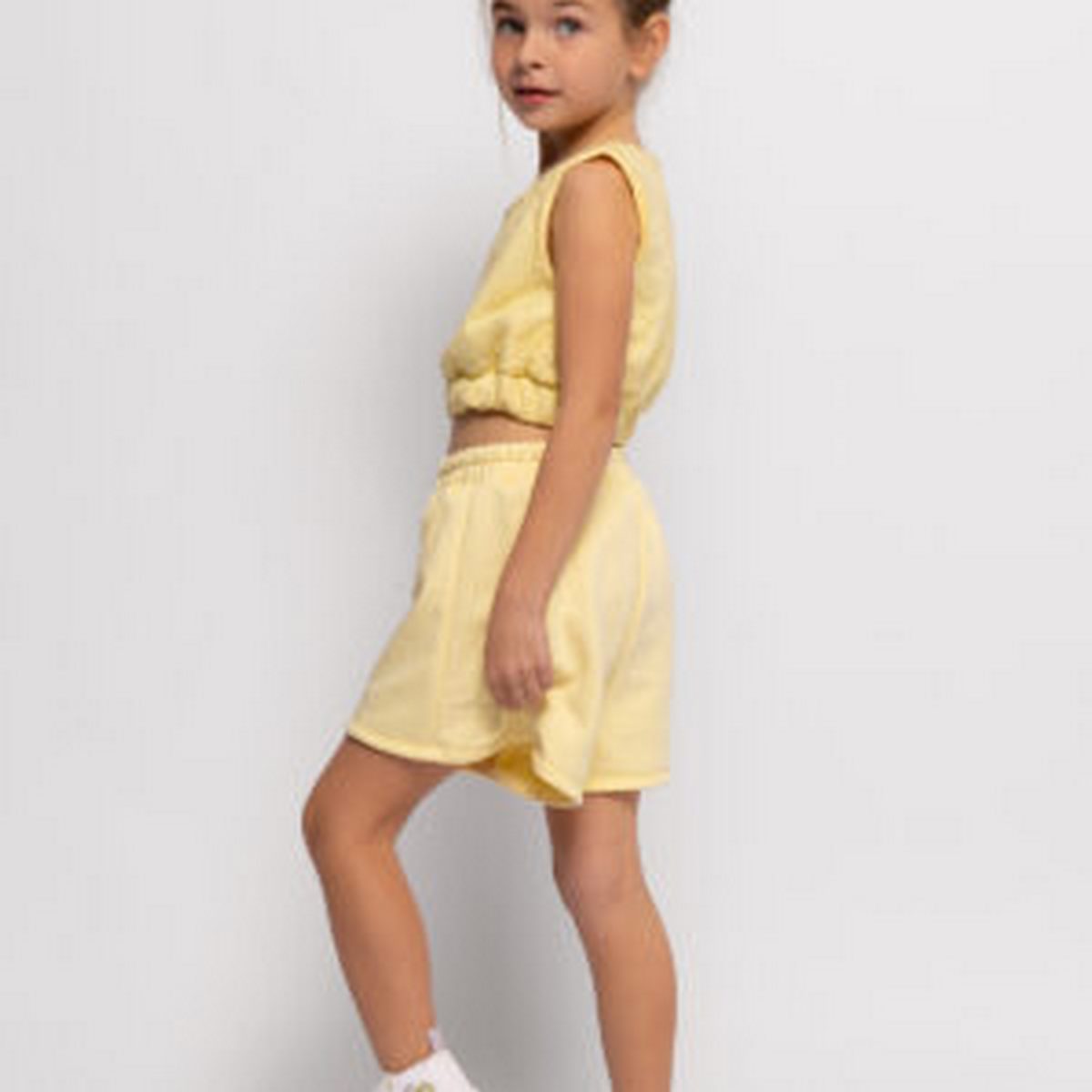 Άνετο και στιλάτο παιδικό σετ σε απαλή απόχρωση του κίτρινου. Το σετ αποτελείται από κοντό τοπ χωρίς μανίκια, με ελαστική μέση για άνετη εφαρμογή, το ύφασμα έχει διακριτική υφή με λεπτομέρεια δαντέλα που χαρίζει ξεχωριστό στυλ και σορτσάκι με λάστιχο στη μέση, ιδανικό για ελευθερία κινήσεων και καθημερινό παιχνίδι. Κατασκευασμένο από μαλακό, δροσερό ύφασμα, ιδανικό για την άνοιξη και το καλοκαίρι. Συνδυάζει πρακτικότητα και μοντέρνο look για κάθε στιγμή της ημέρας.
