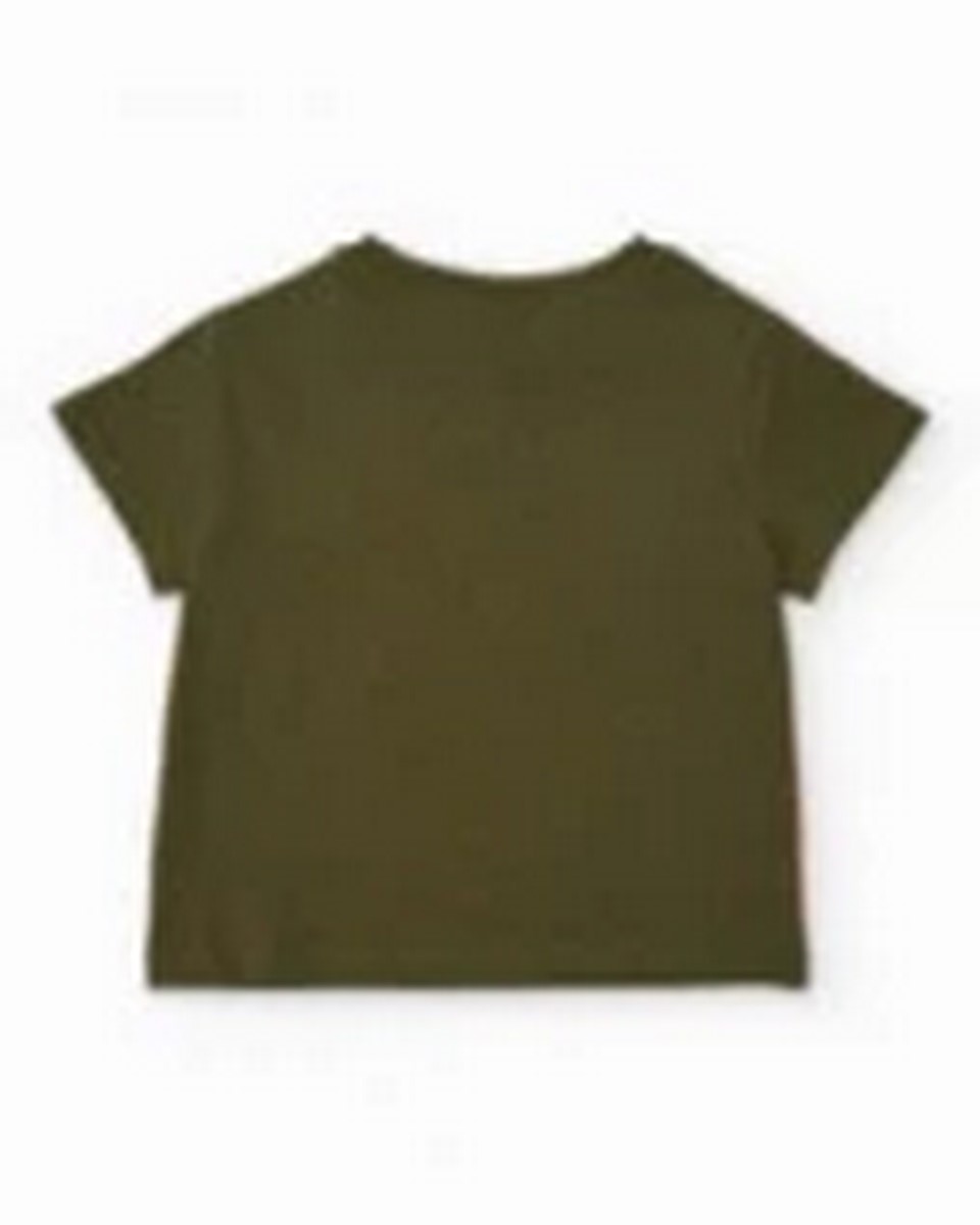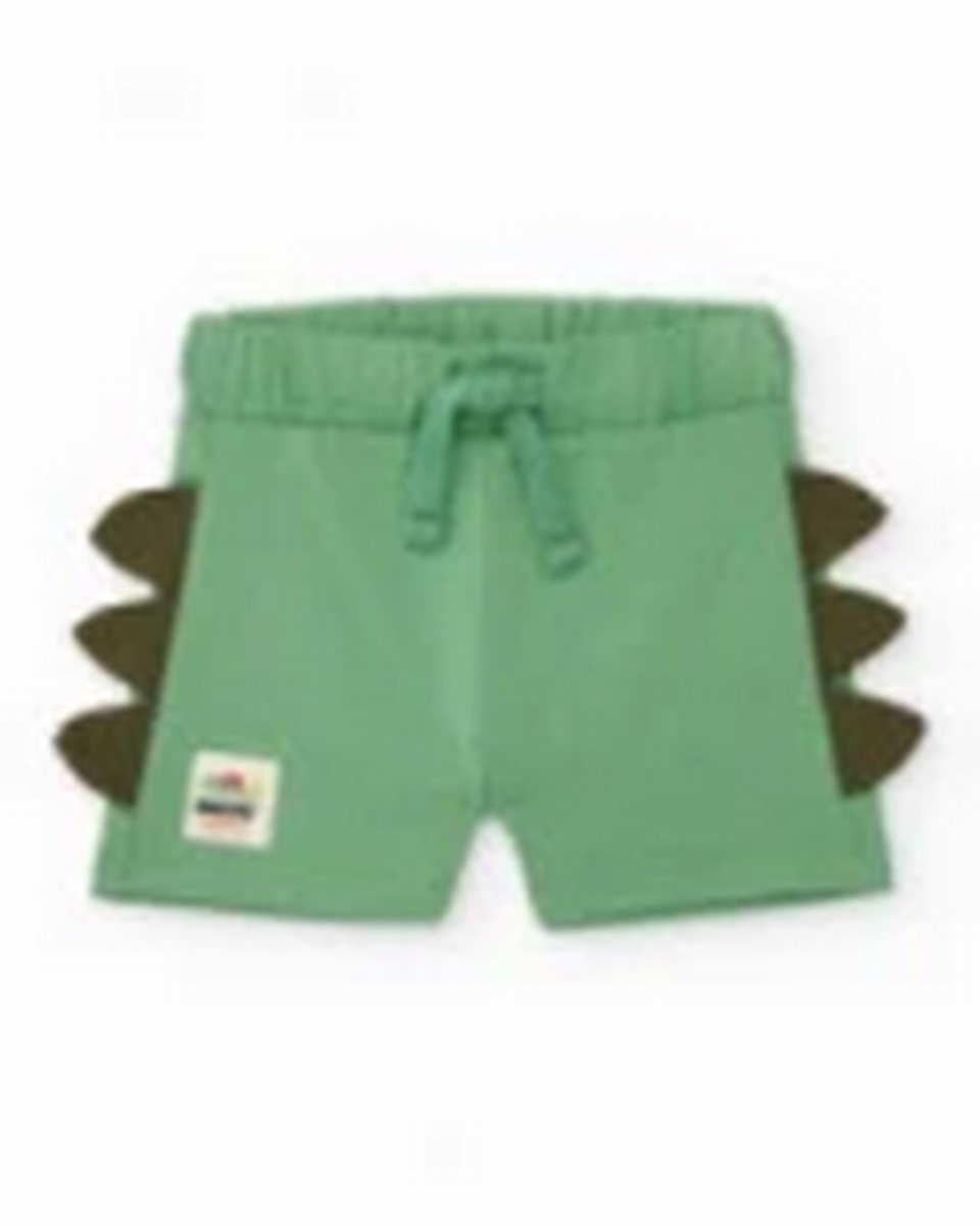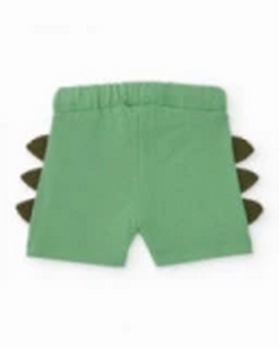 Αγορίστικο σετ σε πράσινους τόνους, που αποτελείται από ένα μπλουζάκι και ένα ασορτί σορτς. Το μπλουζάκι είναι φτιαγμένο από απαλό ύφασμα και διαθέτει ένα έντονο μπροστινό τύπωμα ενός παιχνιδιάρικου δεινόσαυρου ανάμεσα σε φοίνικες, δίνοντας στο ντύσιμο μια διασκεδαστική και ενεργητική εμφάνιση. Ένα τρουκ στον ώμο εξασφαλίζει εύκολο ντύσιμο. Το σορτς έχει ελαστική ζώνη για άνετη εφαρμογή όλη την ημέρα. Τα διακοσμητικά πλαϊνά κομμάτια μιμούνται πιάτα δεινοσαύρων, προσθέτοντας μια μοναδική και ευφάνταστη πινελιά. Μια φρέσκια και πρακτική επιλογή για καθημερινή χρήση.