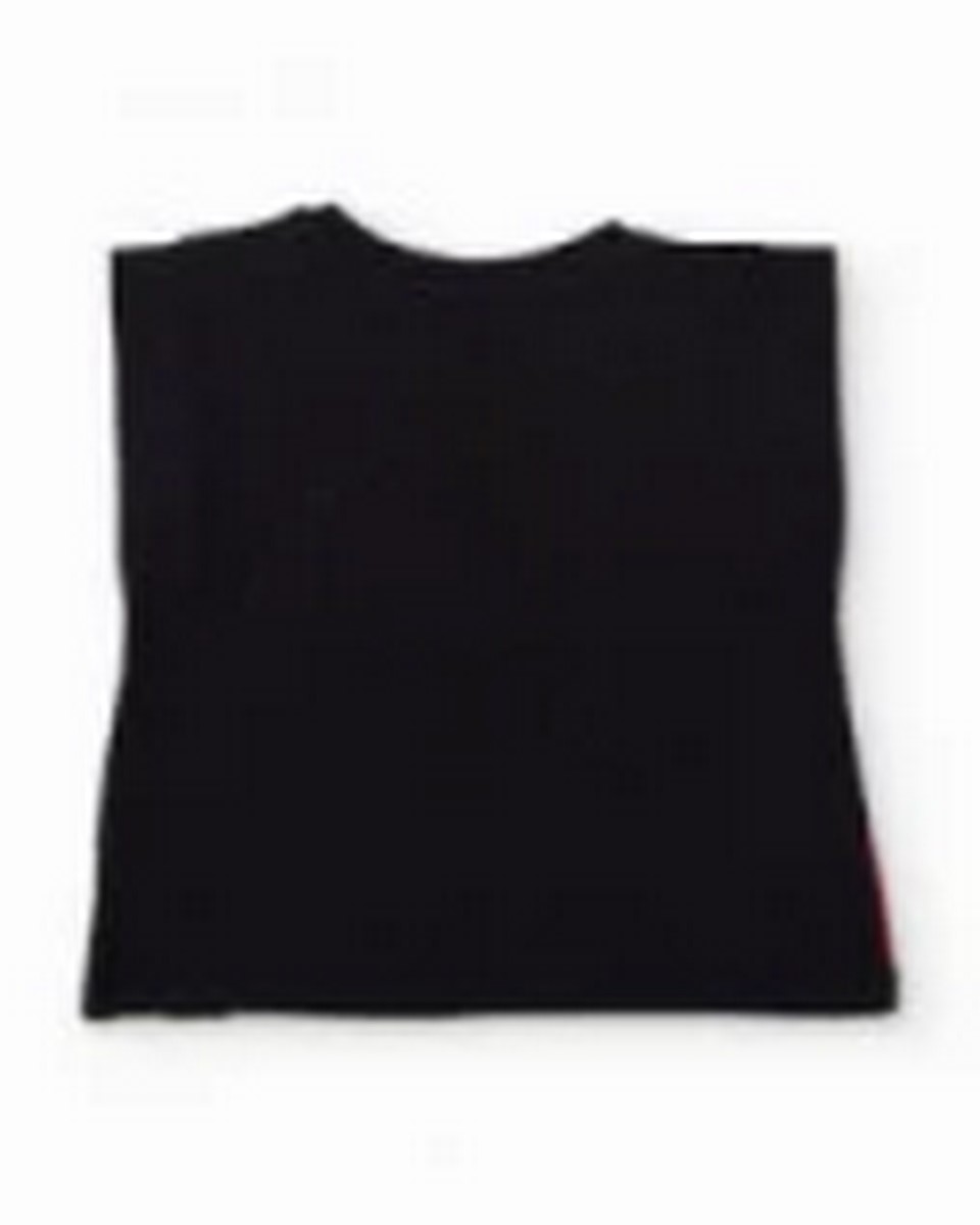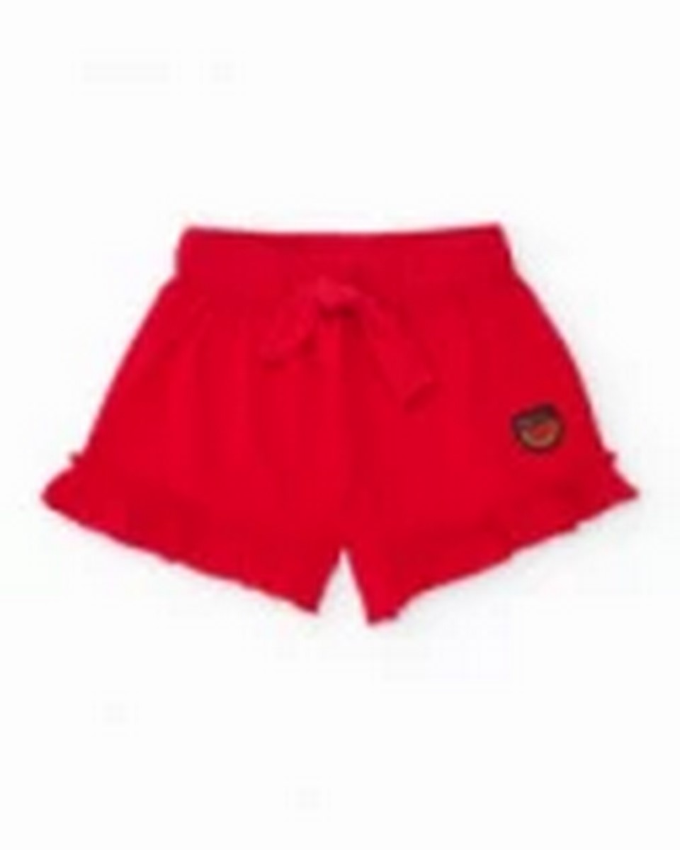 Κοριτσίστικο σετ σε μαύρο και κόκκινο χρώμα, που αποτελείται από ένα απαλό μπλουζάκι και ένα άνετο σορτς για μια διασκεδαστική και καλοκαιρινή εμφάνιση. Το μπλουζάκι διαθέτει έντονα γραφικά φρούτων, συμπεριλαμβανομένων μεγάλων γυαλιών ηλίου με ανάγλυφη απλικέ φράουλα που προσθέτουν ένα εντυπωσιακό τρισδιάστατο εφέ. Έχει κοντά μανίκια και κούμπωμα στον ώμο με κουμπιά για πιο εύκολο ντύσιμο. Το σορτς, σε έντονο κόκκινο χρώμα, περιλαμβάνει ελαστική ζώνη για άνεση και διακοσμητικό βολάν στο στρίφωμα που προσθέτει μια παιχνιδιάρικη, θηλυκή πινελιά. Ένα πολύχρωμο και γοητευτικό ρούχο, ιδανικό για καθημερινή χρήση.
