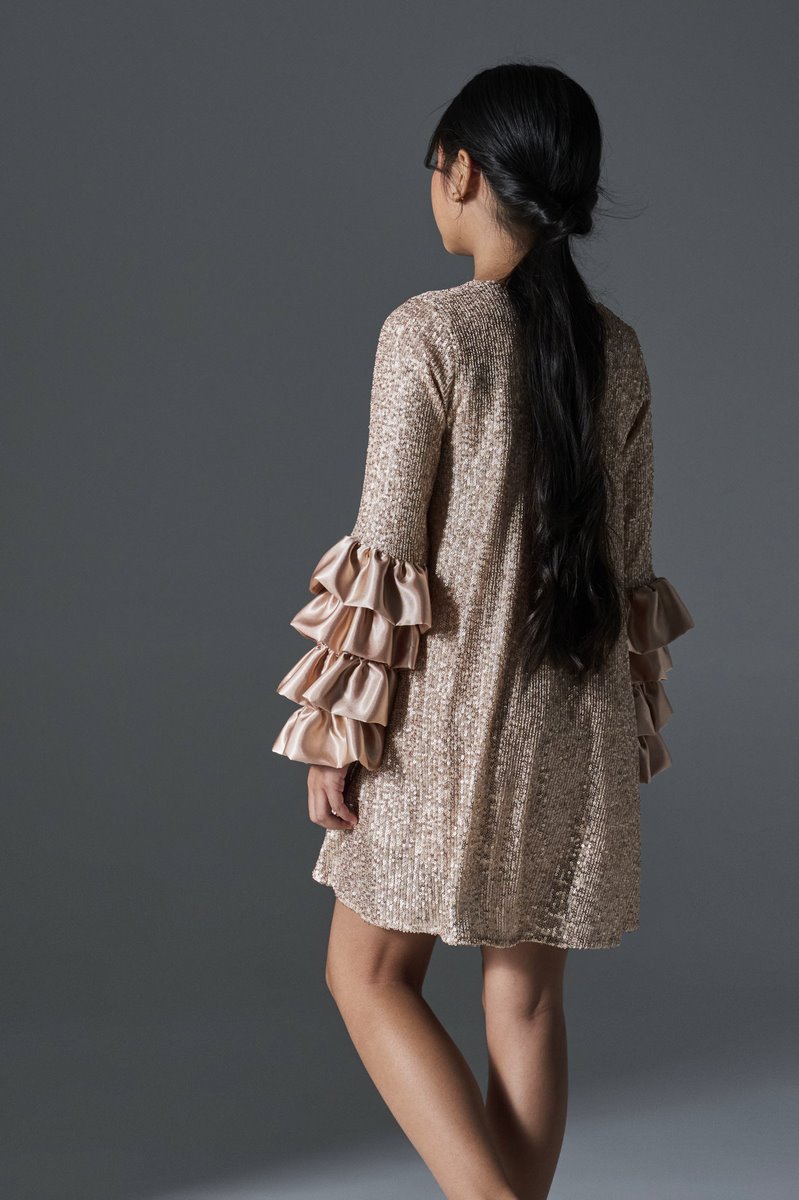 -Παιδικό φόρεμα με παγιέτες σε Α γραμμή με εντυπωσιακά βολάν στα μανίκια από ύφασμα σατέν
