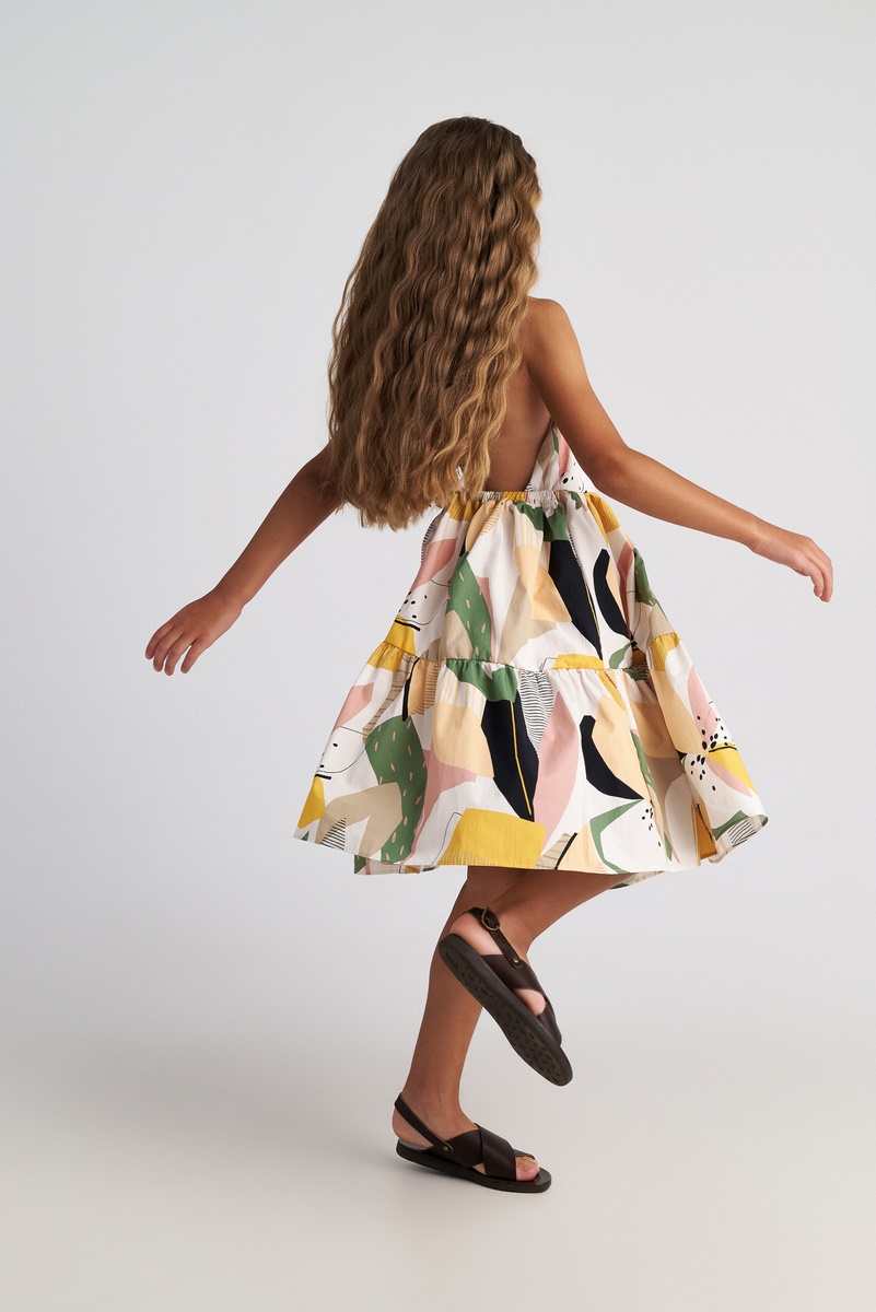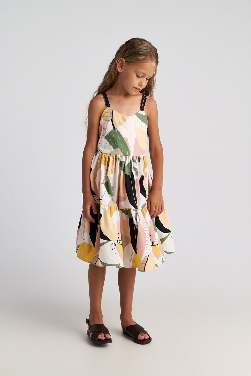 Παιδικό φόρεμα Abstract της Two in a Castle σε εκρού βάση με πολύχρωμο μοτίβο φύλλων και φρούτων, που χαρίζει φρέσκο και καλοκαιρινό χαρακτήρα. Διαθέτει λεπτές τιράντες και άνετη γραμμή, ενώ το πίσω μέρος είναι ανοιχτό με χιαστί τιράντες για ξεχωριστό και μοντέρνο στυλ. Η φούστα είναι ελαφρώς φαρδιά, προσφέροντας ελευθερία κινήσεων και αέρινη αίσθηση. Ιδανικό για καθημερινές εμφανίσεις, βόλτες, διακοπές και καλοκαιρινές εκδηλώσεις.
