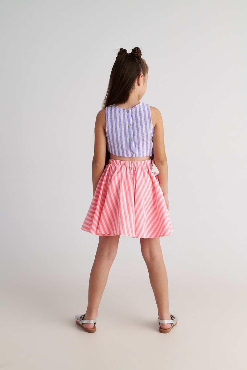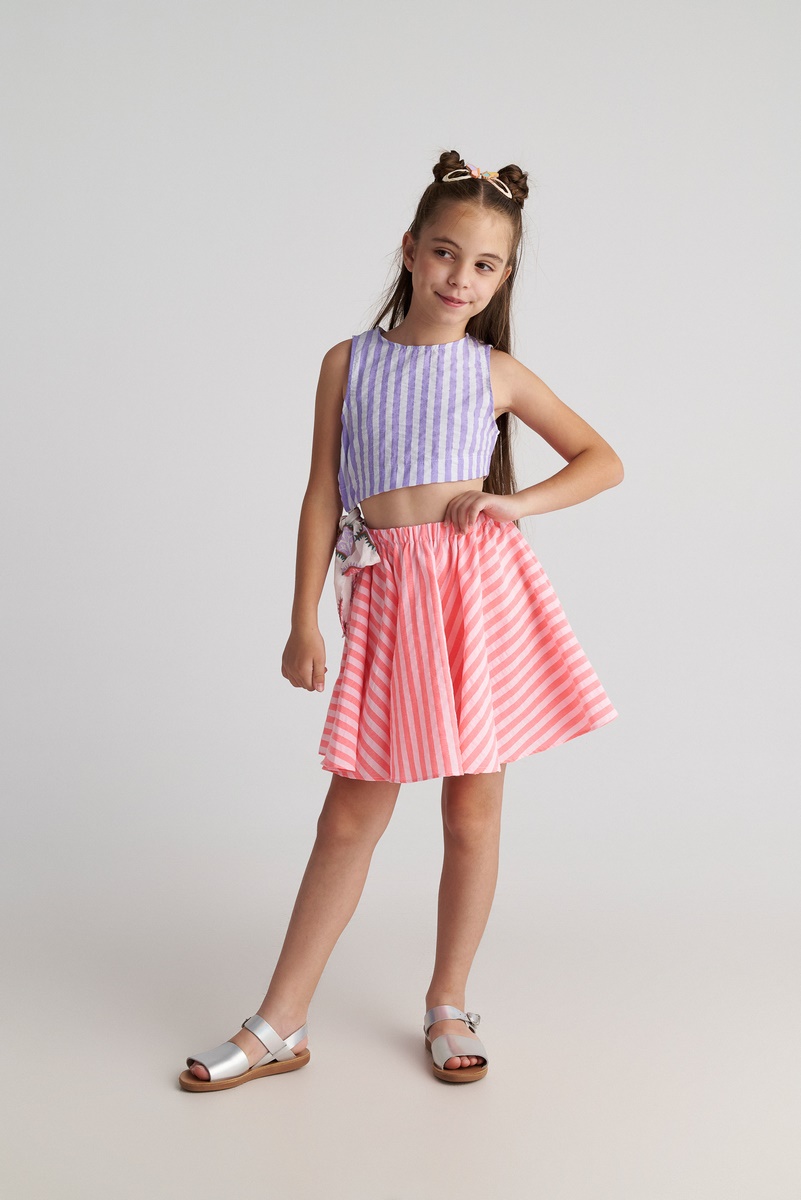 Το παιδικό σετ Radiant της Two In A Castle είναι μια χαρούμενη και ξεχωριστή καλοκαιρινή επιλογή που συνδυάζει άνεση και στυλ. Αποτελείται από ριγέ λιλά τοπ με κουμπιά στην πλάτη και αέρινη κοραλί φούστα με λάστιχο στη μέση για σταθερή αλλά άνετη εφαρμογή. Οι έντονες αλλά αρμονικές αποχρώσεις δημιουργούν ένα παιχνιδιάρικο σύνολο ιδανικό για βόλτες, εκδηλώσεις και καλοκαιρινές εμφανίσεις. Το ύφασμα είναι ελαφρύ και δροσερό, επιτρέποντας στο παιδί να κινείται ελεύθερα όλη μέρα. Φοριέται μαζί ή και χωριστά, δίνοντας πολλές στιλιστικές επιλογές. Ένα κοριτσίστικο outfit που ξεχωρίζει χωρίς υπερβολές και προσφέρει άνεση, στυλ και πρακτικότητα στην καθημερινότητα.