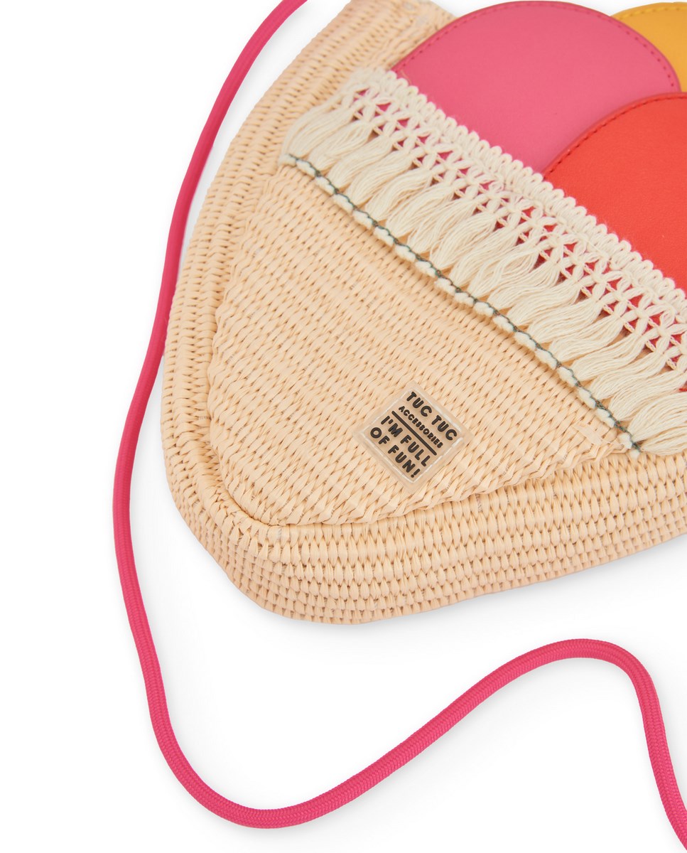 Τσάντα για κορίτσια σε φυσικό χρώμα, κατασκευασμένη από ελαφρύ υφαντό υλικό και σχεδιασμένη σε πρωτότυπο σχήμα χωνιού παγωτού που προσθέτει ένα καλοκαιρινό και παιχνιδιάρικο στυλ. Το μπροστινό μέρος διαθέτει τρία διακοσμητικά στοιχεία σε ροζ, πορτοκαλί και κίτρινο που μοιάζουν με μπάλες παγωτού, δίνοντας στο αξεσουάρ μια ξεχωριστή και εντυπωσιακή πινελιά. Το λεπτό ροζ λουράκι ώμου επιτρέπει την άνετη μεταφορά σε καθημερινή χρήση. Ένα γοητευτικό και γεμάτο χαρακτήρα αξεσουάρ που συμπληρώνει τα ρούχα της μικρής.