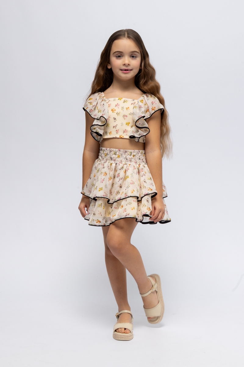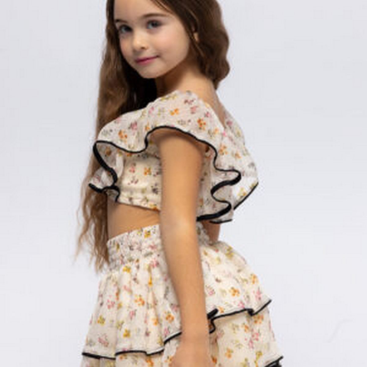 Αυτό το floral σετ είναι η απόλυτη επιλογή για μικρές που αγαπούν τα girly looks με fashion χαρακτήρα. Το σετ αποτελείται από crop top με βολάν και εντυπωσιακή φούστα σε layered γραμμή, διακοσμημένα με delicate floral print που αποπνέει φρεσκάδα και κομψότητα. Τα κυματιστά τελειώματα με αντίθεση στις άκρες προσθέτουν μία ιδιαίτερη couture πινελιά, ενώ η ελαστική μέση εξασφαλίζει άνεση και τέλεια εφαρμογή. Ένα σύνολο ιδανικό για καλοκαιρινές εμφανίσεις, γιορτές, βαφτίσεις ή ξεχωριστές στιγμές.
