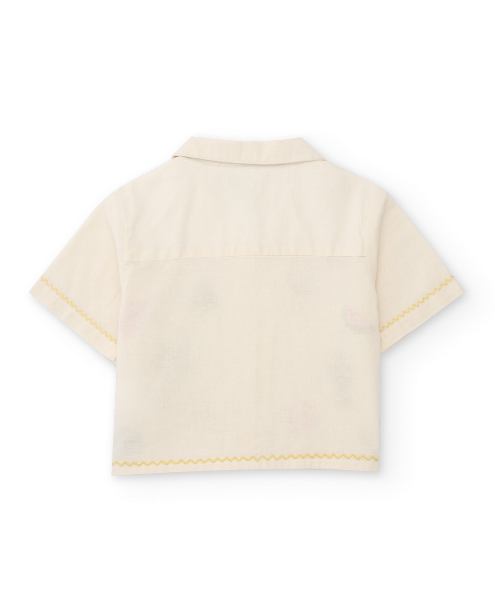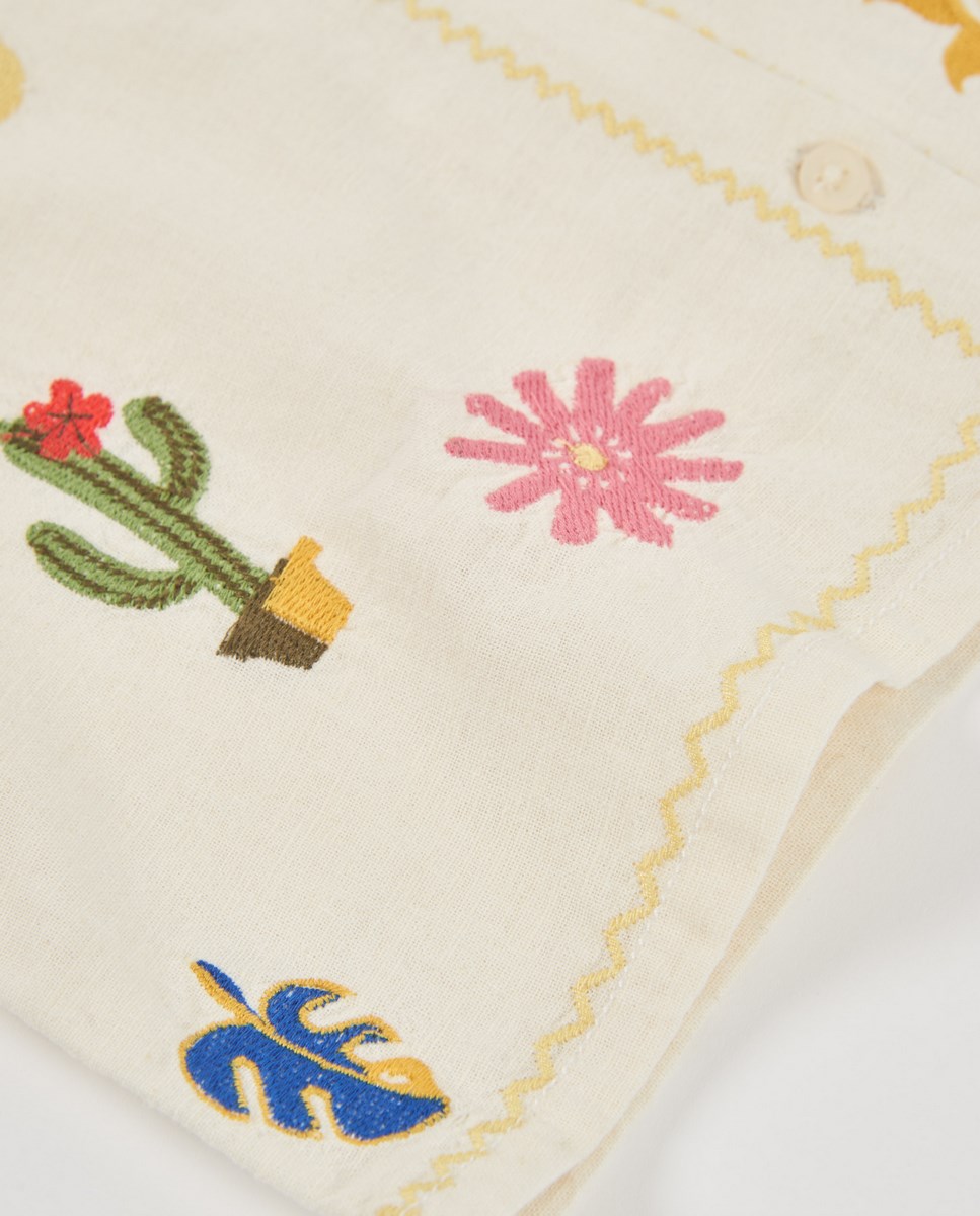 Αυτό το ανοιχτό μπεζ κοριτσίστικο πουκάμισο είναι φτιαγμένο από απαλό, ελαφρύ ύφασμα που προσφέρει άνεση τις πιο ζεστές μέρες. Διαθέτει κοντά μανίκια, κλασικό γιακά και κλείσιμο με κουμπιά μπροστά, διατηρώντας μια φρέσκια και χαλαρή εμφάνιση. Ενσωματώνει πολλά πολύχρωμα κεντήματα εμπνευσμένα από το καλοκαίρι, όπως φρούτα, λουλούδια και τροπικά μοτίβα, προσθέτοντας έναν χαρούμενο και ξεχωριστό χαρακτήρα στο ρούχο. Οι κυματιστές μανσέτες και το στρίφωμα ολοκληρώνουν την εμφάνιση με μια χειροποίητη και διακοσμητική πινελιά. Μια γοητευτική επιλογή για τη δημιουργία ζωντανών συνόλων.